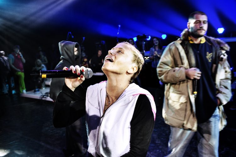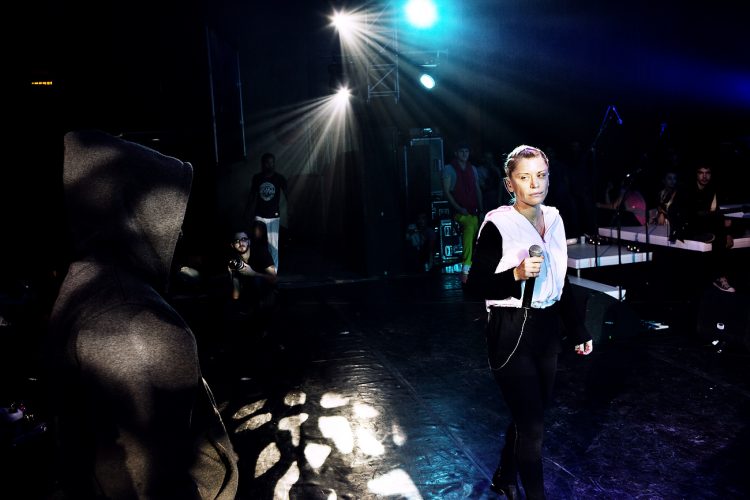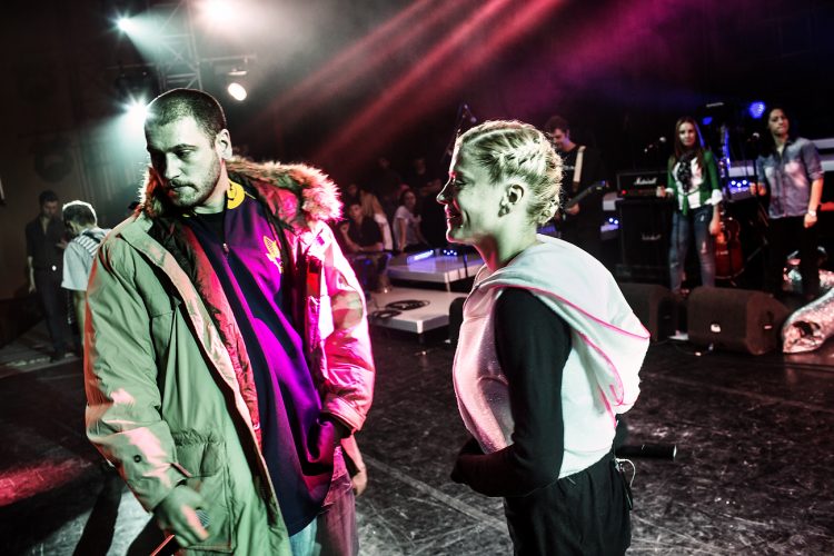 Uzzi (face covered by hood) and Loredana, a famous Romanian pop singer, seen during rehearsals for her anniversary show at Sala Palatului on November 25, 2012. B.U.G. Mafia - Bucharest Underground Mafia, is a Romanian hip hop group from Pantelimon, Bucharest, widely regarded as one of the seminal acts of gangsta rap in Romania. Founded in 1993, it was among the first Romanian hip hop acts.