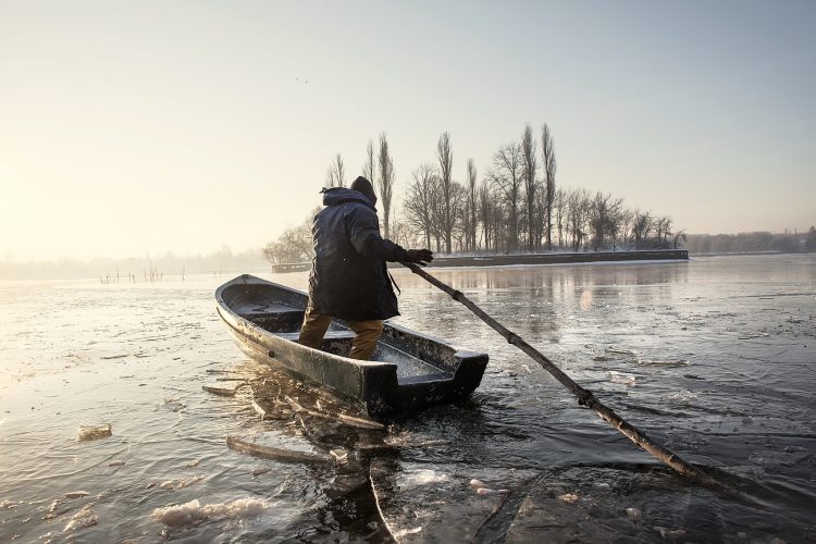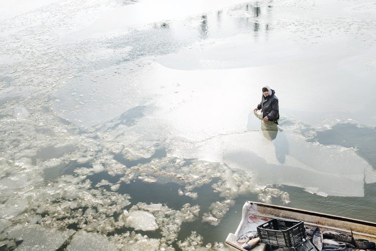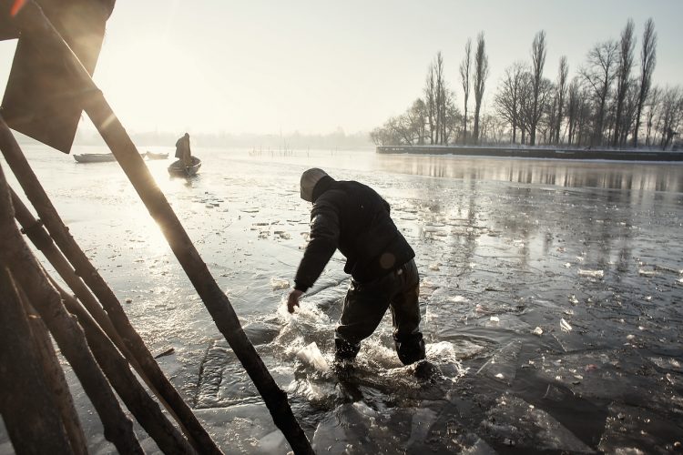 Man breaking with his weight the ice around the docking area, as seen on December 12, 2012. Fisherman collect fish from Herastrau, a natural lake situated in the northern part of Bucharest, Hundreds of kilograms are collected daily to be sold to local fish markets as the lake is slowly freezing, making net fishing virtually impossible.