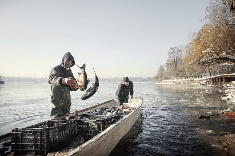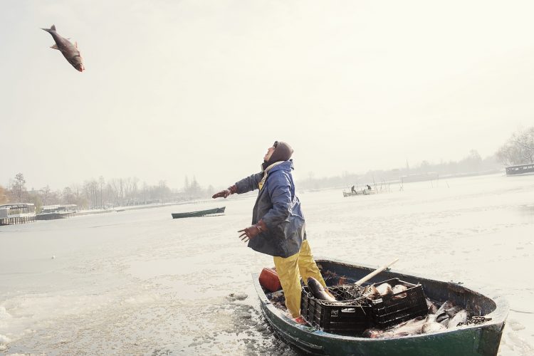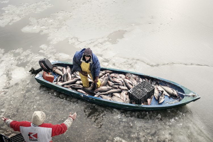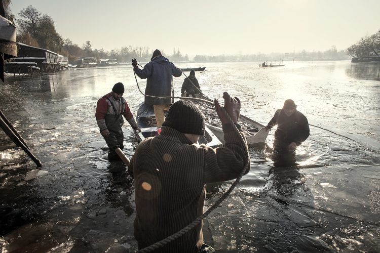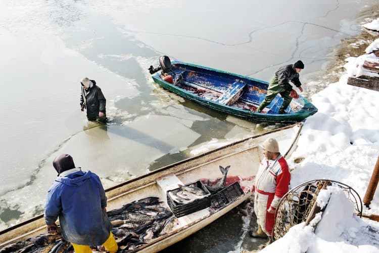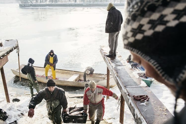 People collecting fish from Herastrau, a natural lake situated in the northern part of Bucharest, as seen on December 12, 2012. Hundreds of kilograms are collected daily to be sold to local fish markets as the lake is slowly freezing.
