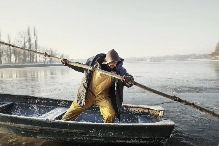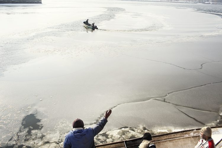 Man breaking with his weight the ice around the docking area, as seen on December 14, 2012. Fisherman collect fish from Herastrau, a natural lake situated in the northern part of Bucharest, Hundreds of kilograms are collected daily to be sold to local fish markets as the lake is slowly freezing, making net fishing virtually impossible.