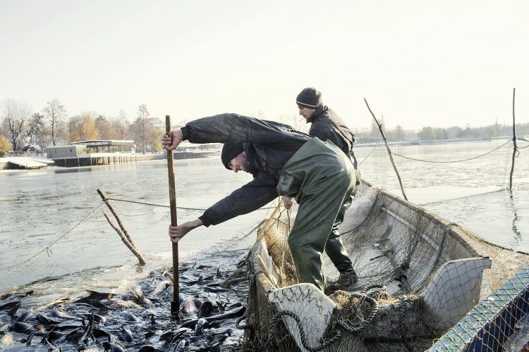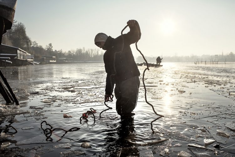 Fisherman equipping to collect fish from Herastrau, a natural lake situated in the northern part of Bucharest, as seen early morning on December 14, 2012. Hundreds of kilograms are collected to be sold to local fish markets as the lake is slowly freezing, making net fishing virtually impossible.