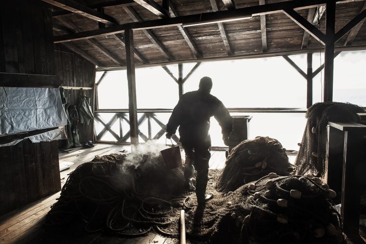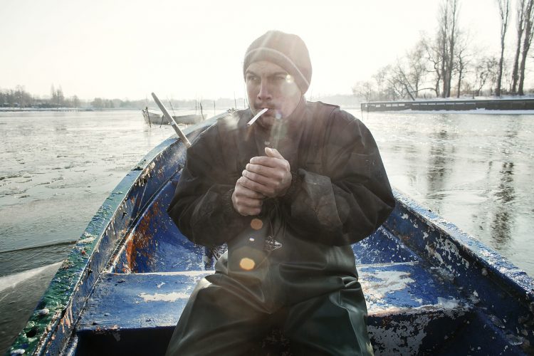 Man lights a cigaret on his way to the the fishing net installed in the middle of the lake, as seen on December 13, 2012. Fisherman collect fish from Herastrau, a natural lake situated in the northern part of Bucharest. Hundreds of kilograms are collected daily to be sold to local fish markets as the lake is slowly freezing, making net fishing virtually impossible.