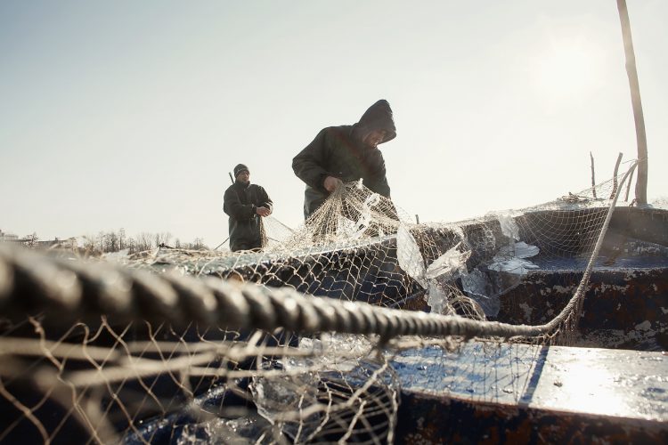 Fisherman using hot water to unfreeze the ropes as they prepare to collect fish from Herastrau, a natural lake situated in the northern part of Bucharest as seen on December 13, 2012. Hundreds of kilograms are collected daily to be sold to local fish markets as the lake is slowly freezing, making net fishing virtually impossible.