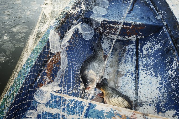 Romanian carp freshly taken from the water by professional fisherman collecting fish from Herastrau, a natural lake situated in the northern part of Bucharest as seen on December 13, 2012. Hundreds of kilograms are collected to be sold to local fish markets as low winter temperatures make net fishing virtually impossible.