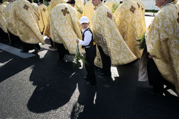Son of a priest walks by his father and other priests during an orthodox PalmSunday pilgrimage from National Cathedral to the Patriarchy as seen in Romania, Saturday 27, 2013.