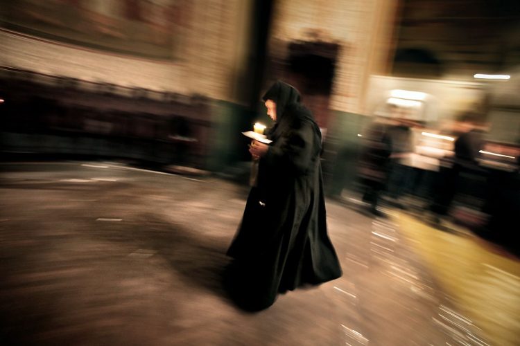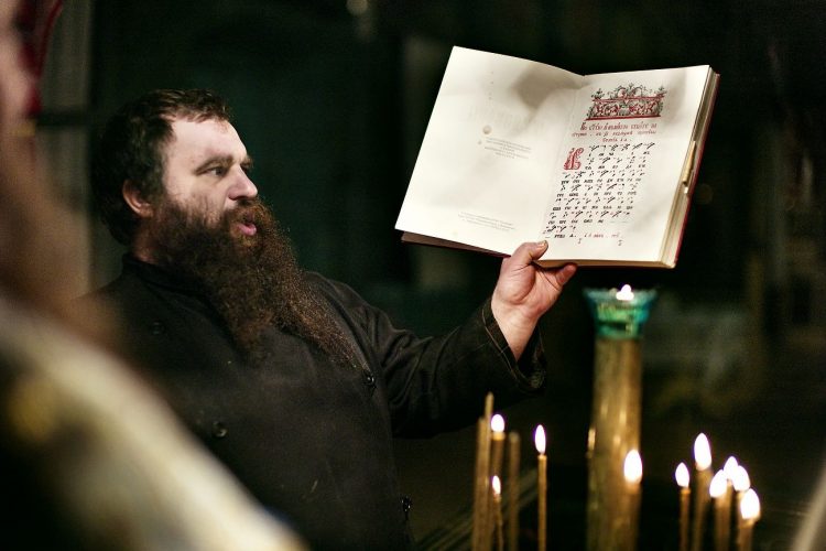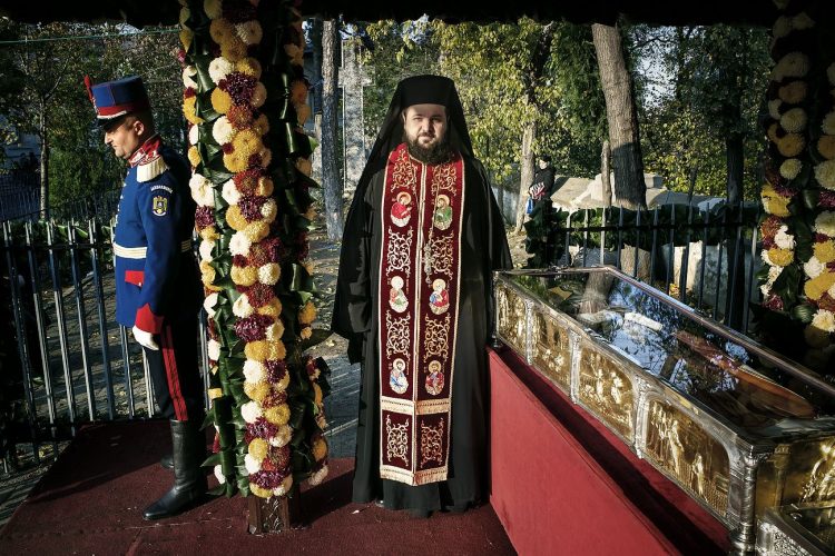Romanian Orthodox priest near the relics of Saint Dimitrie The New at the Romanian Orthodox Patriarchy in Bucharest on October 26, 2013. Tens of thousands of Romanians started to come since Wednesday at the Romanian Patriarchy to celebrate the day of St. Dimitrie The New considered to be the protector of Bucharest. In the Orthodox tradition it is believed that touching relics bring luck and health to the believers and their families.