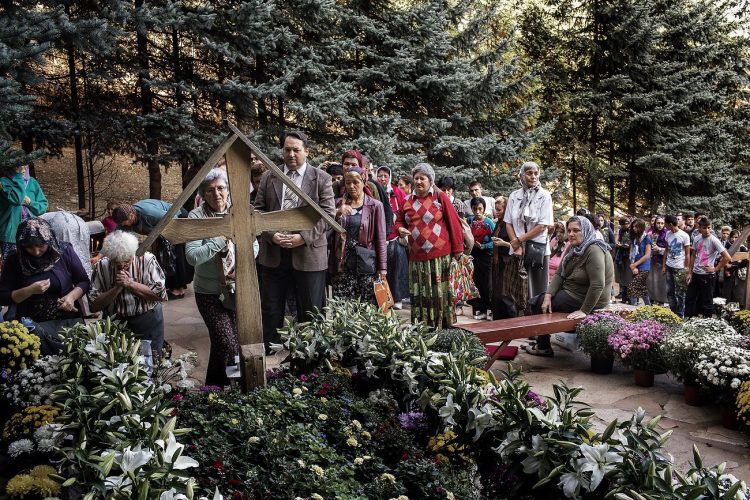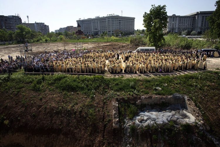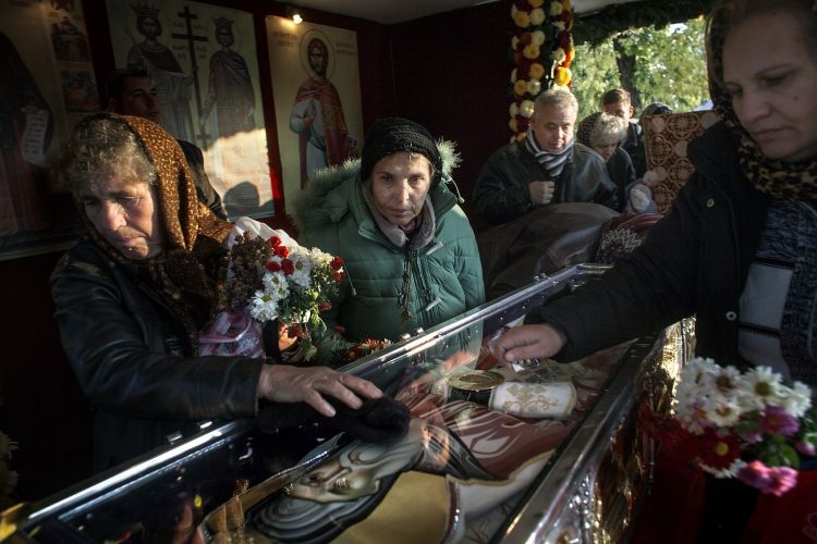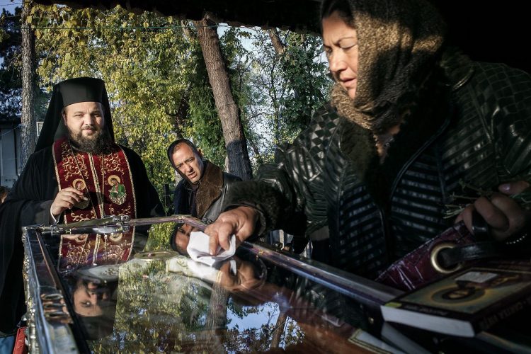 Romanian Orthodox believers touching the relics of Saint Dimitrie The New at the Romanian Orthodox Patriarchy in Bucharest on October 26, 2013. Tens of thousands of Romanians started to come since Wednesday at the Romanian Patriarchy to celebrate the day of St. Dimitrie The New considered to be the protector of Bucharest. In the Orthodox tradition it is believed that touching relics bring luck and health to the believers and their families.