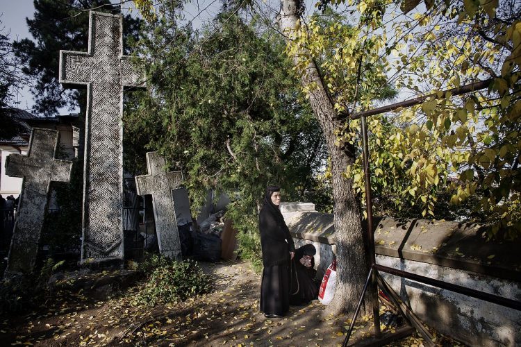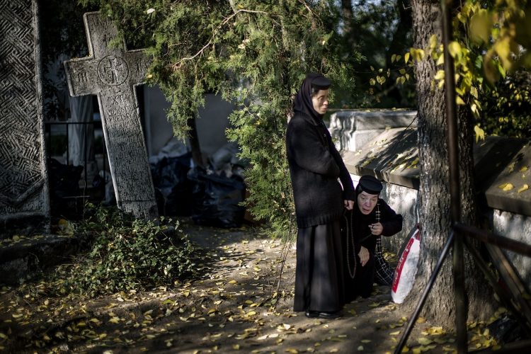Romanian Orthodox nuns seen praying after touching the relics of Saint Dimitrie The New at the Romanian Orthodox Patriarchy in Bucharest on October 26, 2013. Tens of thousands of Romanians started to come since Wednesday at the Romanian Patriarchy to celebrate the day of St. Dimitrie The New considered to be the protector of Bucharest. In the Orthodox tradition it is believed that touching relics bring luck and health to the believers and their families.
