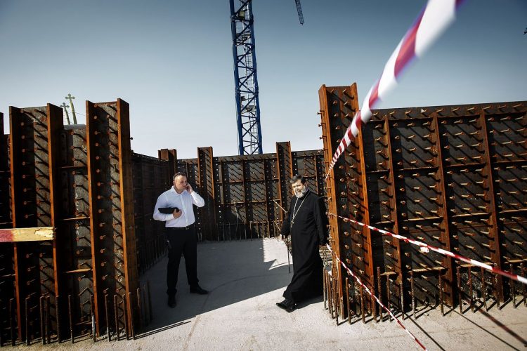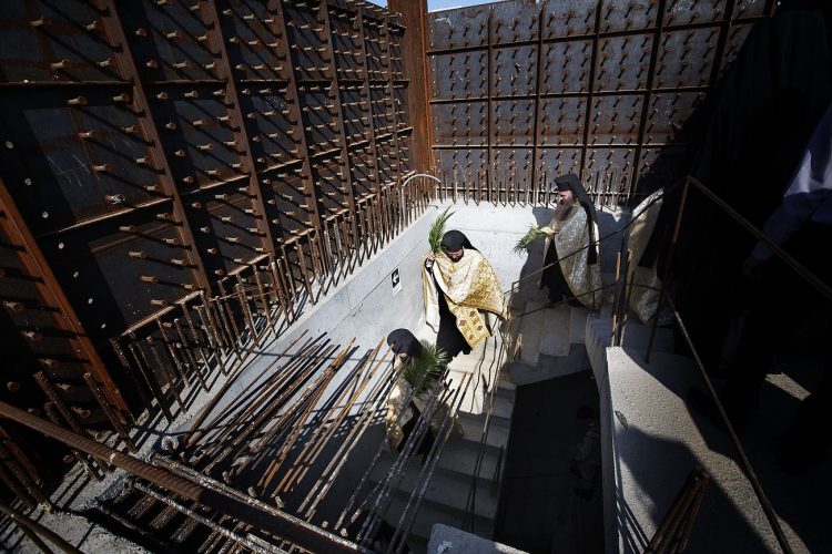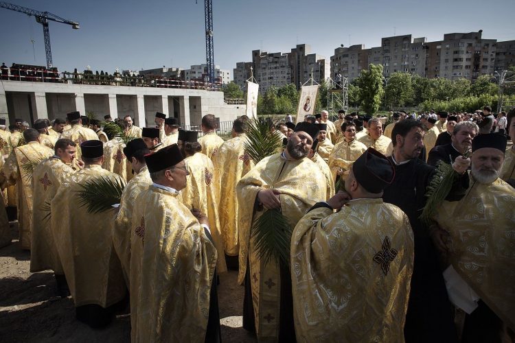 Priest Crangasu walks by while Daniel, the Patriarch of the Romanian Orthodox Church, ends his blessing ceremony of the believers outside the National Cathedral. Priests walk during an orthodox PalmSunday pilgrimage from National Cathedral to the Patriarchy as seen in Romania, Saturday 27, 2013.