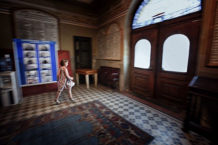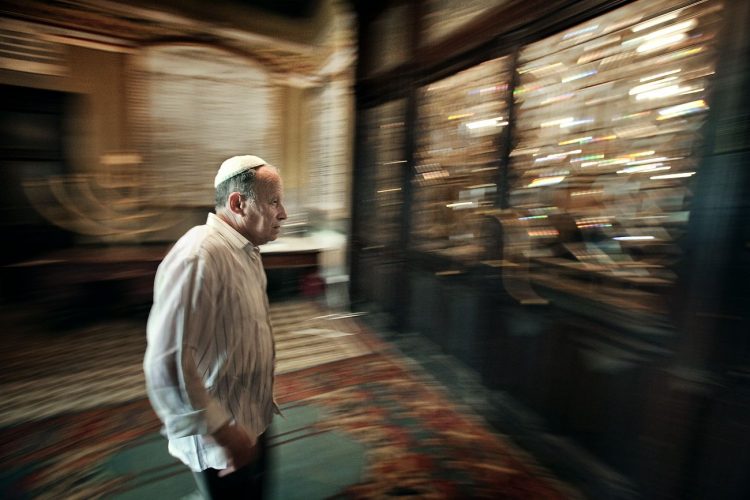 Seen through the glass door of the Great Synagogue, Jewish cantor Iosif Adler, right, reads a prayer to members of the Romanian Jewish community as rabi Shlomo Sorin Rosen, left, looks on in Bucharest, Romania, Tuesday, March 30, 2010, at the beginning of the Passover holiday. The religious festival of Passover is a week-long festival which commemorates the exodus of the ancient Hebrews from Egypt.
