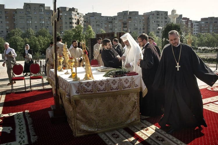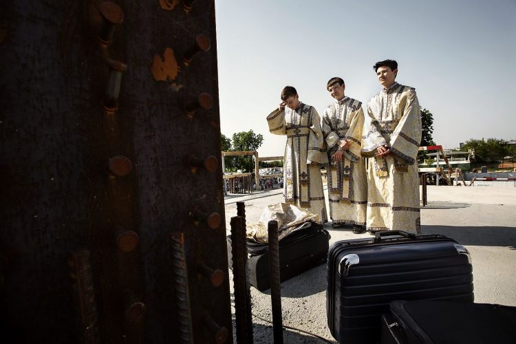 Priests suiting up while Daniel, the Patriarch of the Romanian Orthodox Church, delivers his blessing ceremony of the believers outside the National Cathedral. Priests walk during an orthodox PalmSunday pilgrimage from National Cathedral to the Patriarchy as seen in Romania, Saturday 27, 2013.