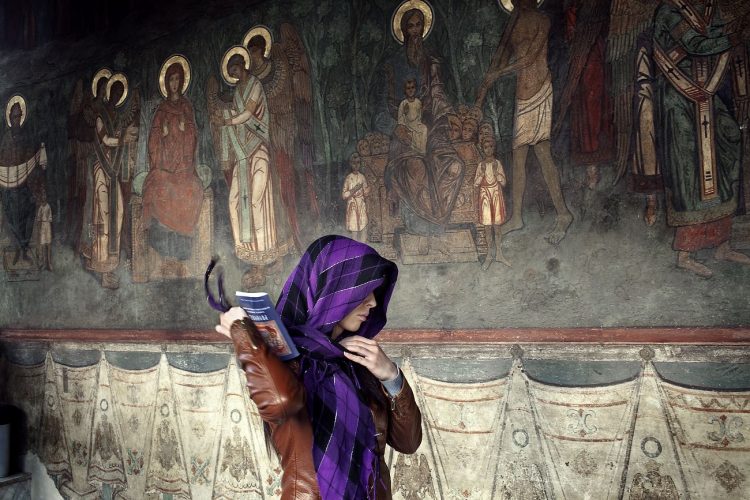 An Ethnic Russian woman walks in a church during an Easter religious service in Sarichioi, Romania, Sunday, April 4, 2010. The Russian minority which inhabits regions in the Danube Delta in Romania and consists mostly of fishermen celebrates Easter along with the country's Catholics and the Orthodox majority.