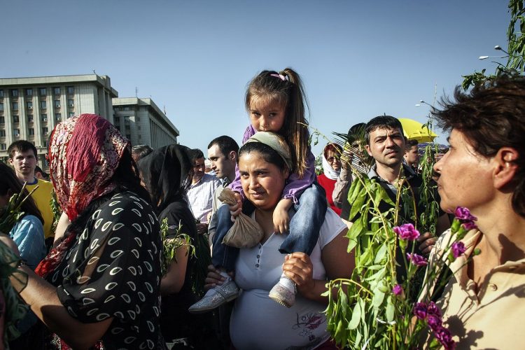 People await to receive Daniel's, the Patriarch of the Romanian Orthodox Church, blessing outside the National Cathedral. Priests walk during an orthodox PalmSunday pilgrimage from National Cathedral to the Patriarchy as seen in Romania, Saturday 27, 2013.