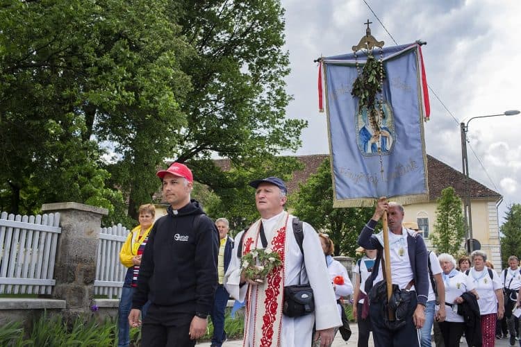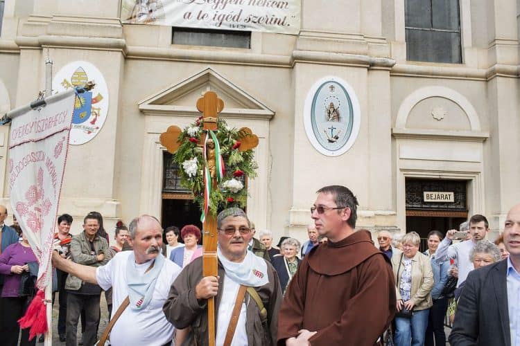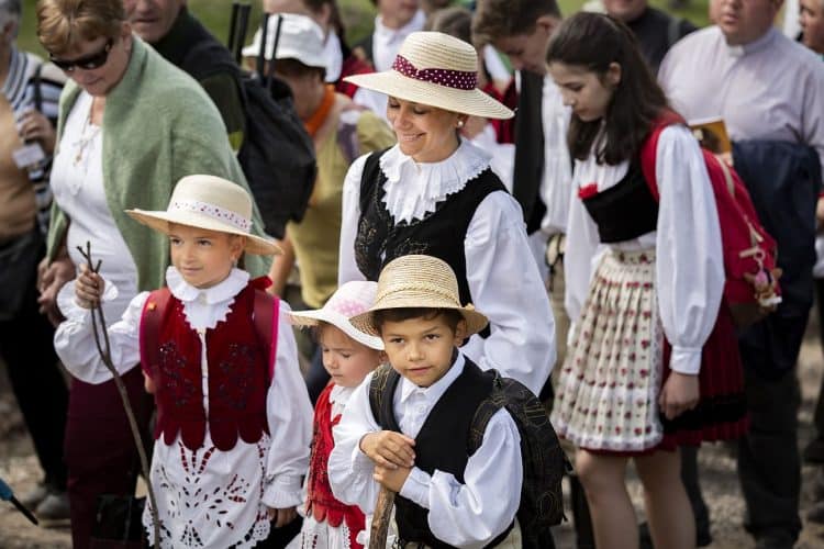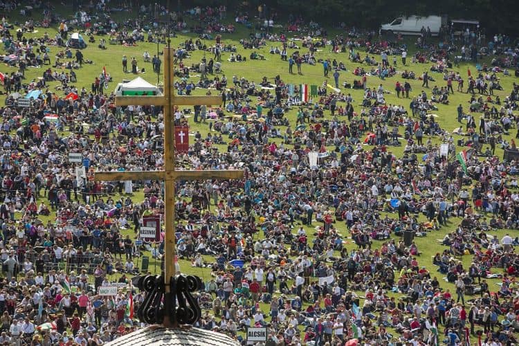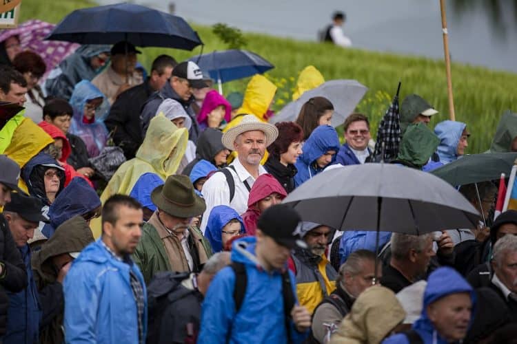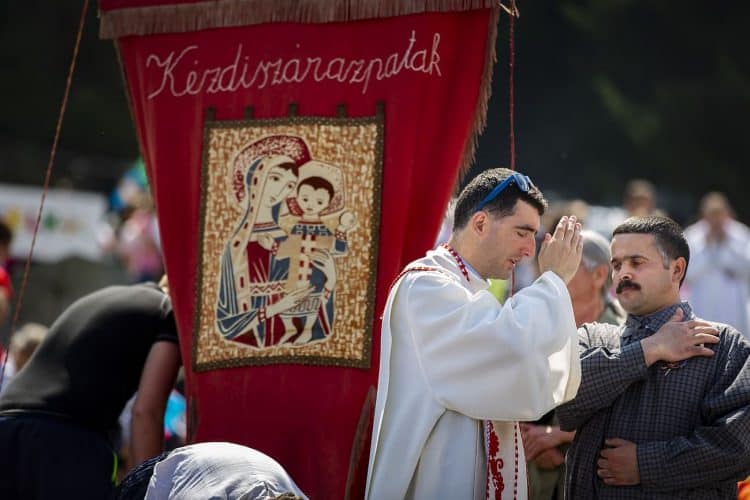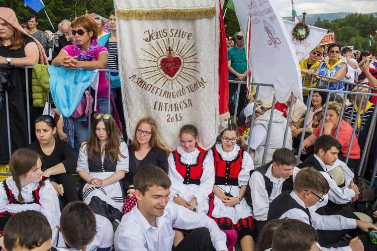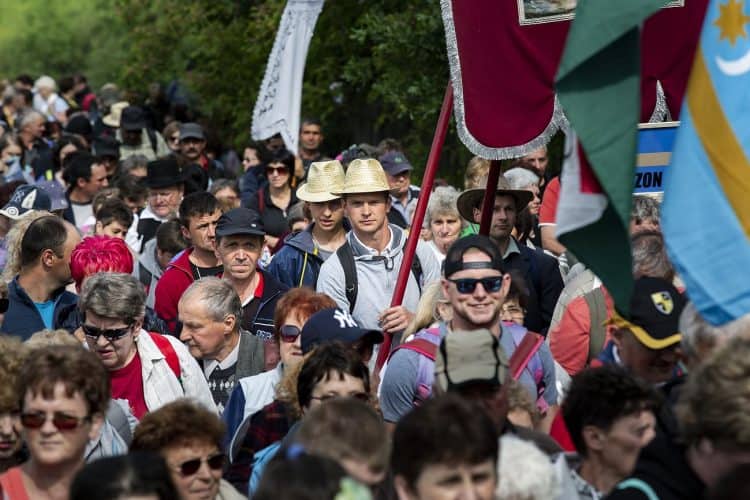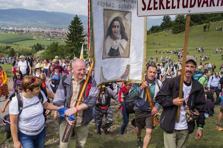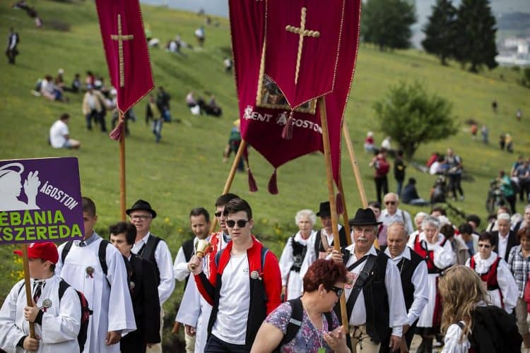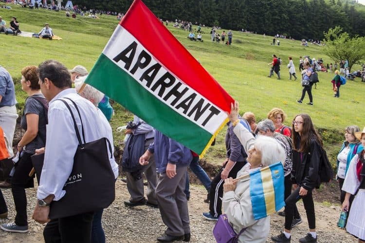 SUMULEU CIUC, ROMANIA - MAY 18: Hungarians from all over the world attending the early pilgrimage hold at Sumuleu Ciuc in Romania, as seen on May 18, 2018. Sumuleu Ciuc became a pilgrimage site in 1567, when Hungarian king John II Sigismund Zápolya wanted to convert the Székely population of the upper Csík to Protestantism. The Székelys refused to abandon the Catholic faith and resisted. A battle took place on a nearby field, on Saturday before Pentecost 1567, from which the Székelys emerged victorious. The monks saw this as a sign of the care of Virgin Mary, and since then, this event has been commemorated by a pilgrimage when the believers gather on Pentecost every year. Beside its religious importance, the pilgrimage has also become a community event demonstrating spiritual unity of Hungarian people living in and outside the historical region of Transylvania. © Mugur Varzariu