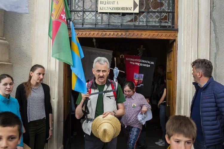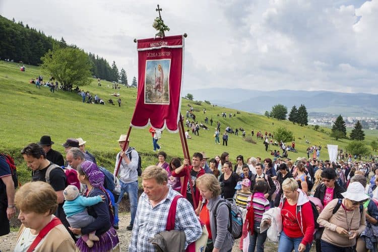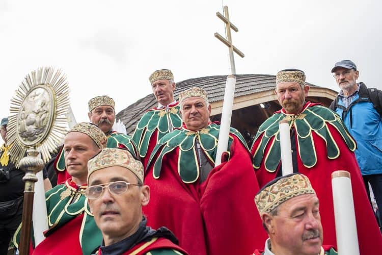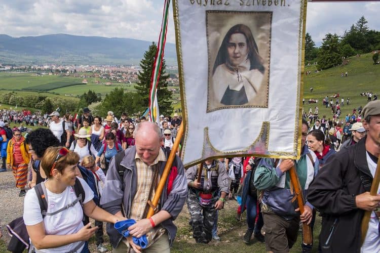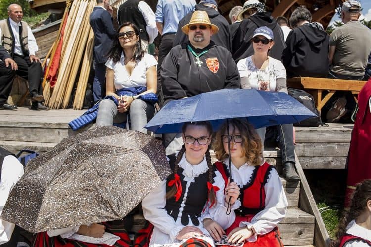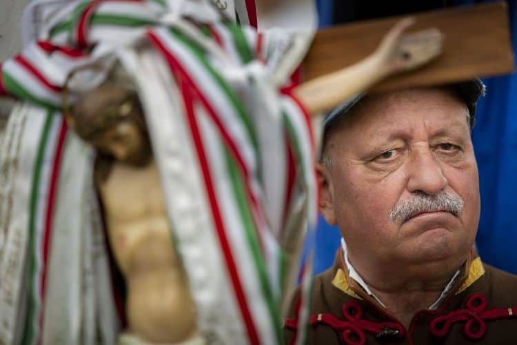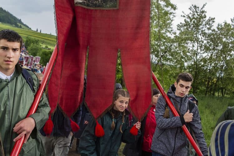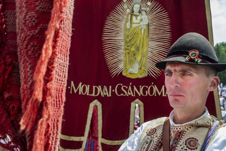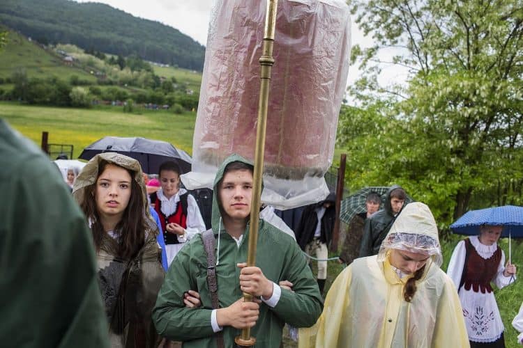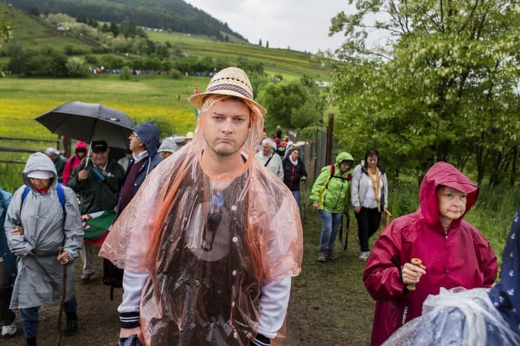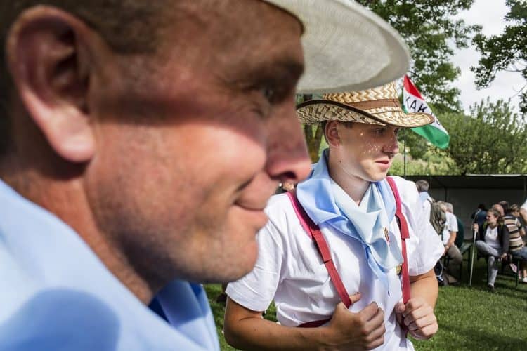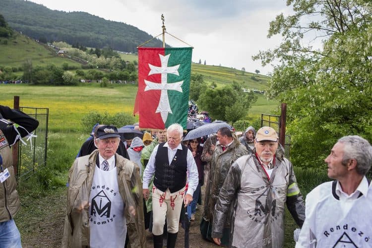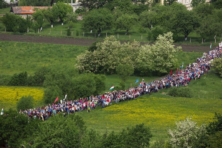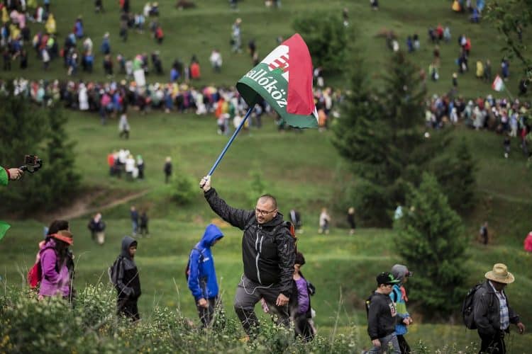 SUMULEU CIUC, ROMANIA - MAY 18: Hungarians from all over the world attending the early pilgrimage hold at Sumuleu Ciuc in Romania, as seen on May 18, 2018. Sumuleu Ciuc became a pilgrimage site in 1567, when Hungarian king John II Sigismund Zápolya wanted to convert the Székely population of the upper Csík to Protestantism. The Székelys refused to abandon the Catholic faith and resisted. A battle took place on a nearby field, on Saturday before Pentecost 1567, from which the Székelys emerged victorious. The monks saw this as a sign of the care of Virgin Mary, and since then, this event has been commemorated by a pilgrimage when the believers gather on Pentecost every year. Beside its religious importance, the pilgrimage has also become a community event demonstrating spiritual unity of Hungarian people living in and outside the historical region of Transylvania. Photography by Mugur Varzariu/Getty Images/Newsweek.