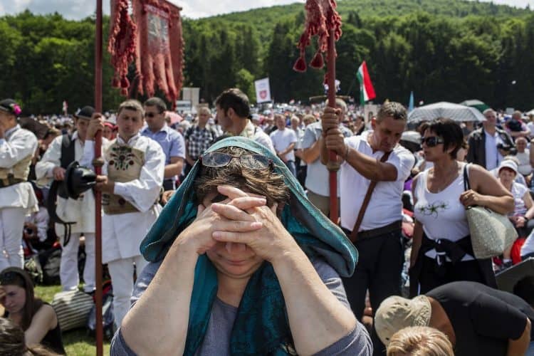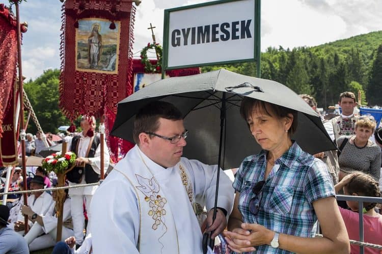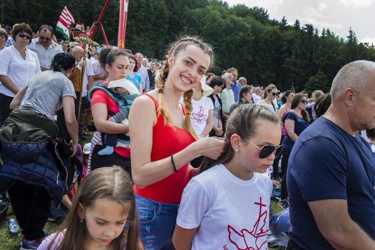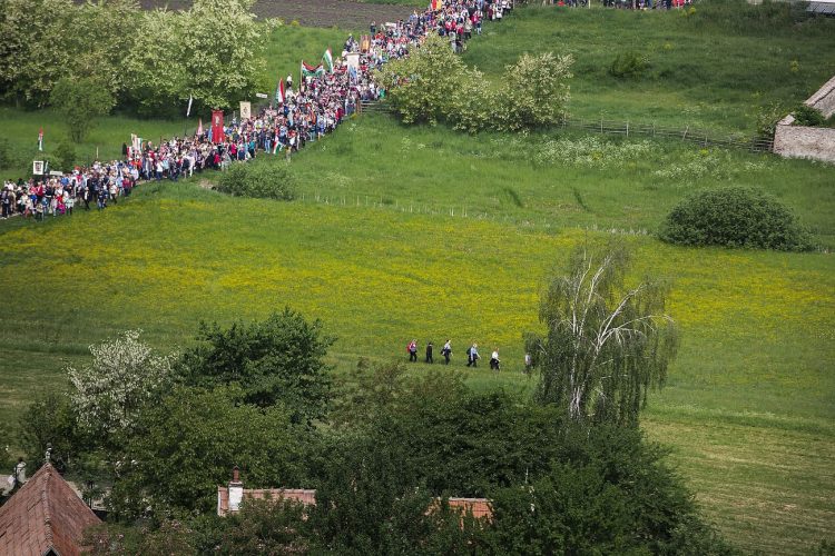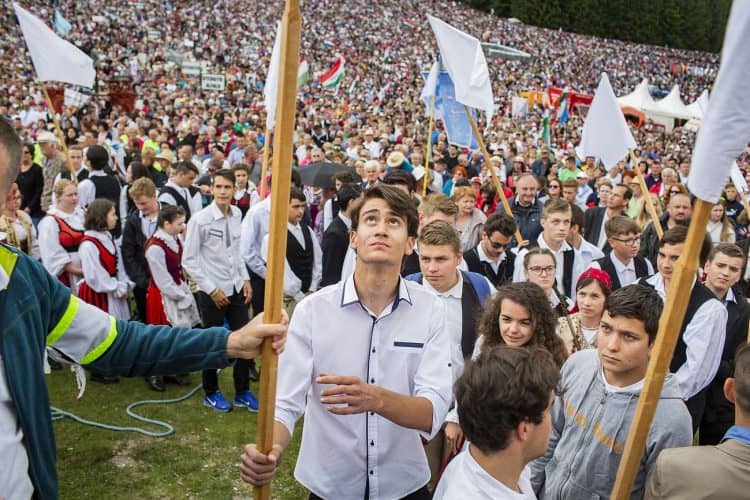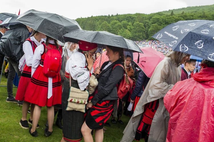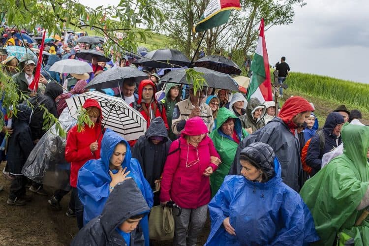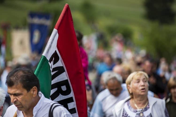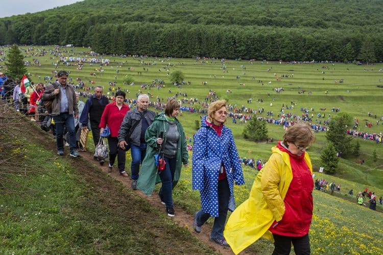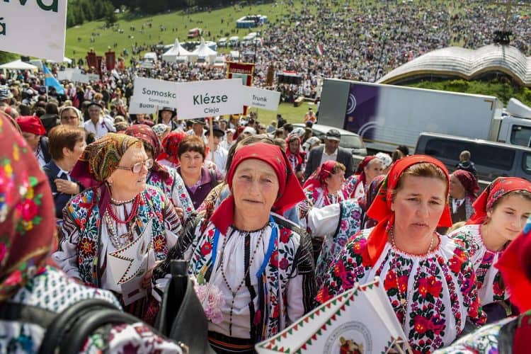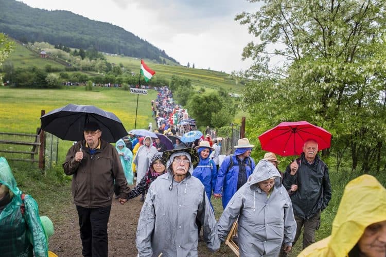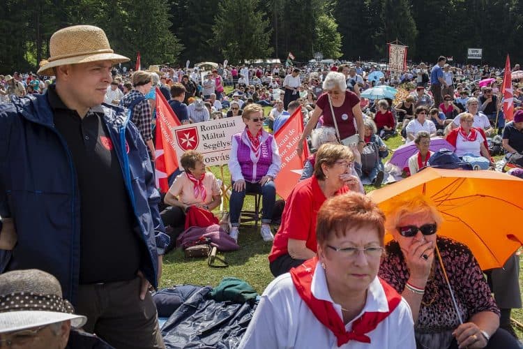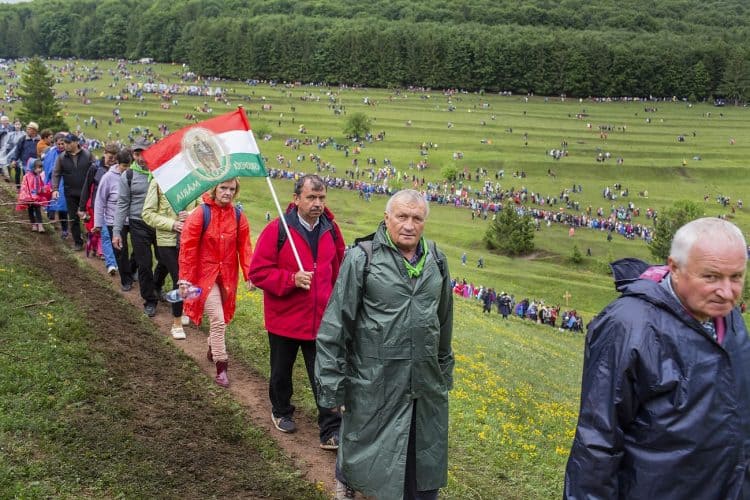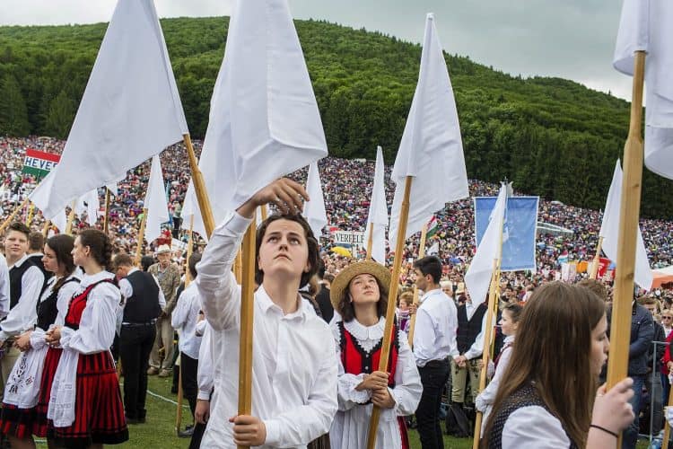 SUMULEU CIUC, ROMANIA - MAY 18: Hungarians from all over the world attending the early pilgrimage hold at Sumuleu Ciuc in Romania, as seen on May 18, 2018. Sumuleu Ciuc became a pilgrimage site in 1567, when Hungarian king John II Sigismund Zpolya wanted to convert the Szkely population of the upper Csk to Protestantism. The Szkelys refused to abandon the Catholic faith and resisted. A battle took place on a nearby field, on Saturday before Pentecost 1567, from which the Szkelys emerged victorious. The monks saw this as a sign of the care of Virgin Mary, and since then, this event has been commemorated by a pilgrimage when the believers gather on Pentecost every year. Beside its religious importance, the pilgrimage has also become a community event demonstrating spiritual unity of Hungarian people living in and outside the historical region of Transylvania. Photography by Mugur Varzariu/Getty Images/Newsweek.