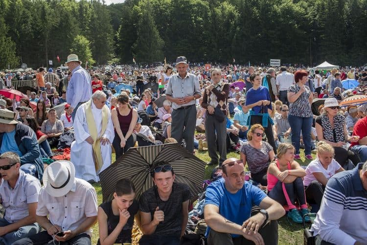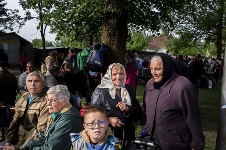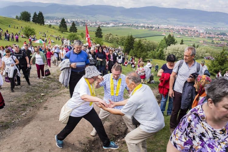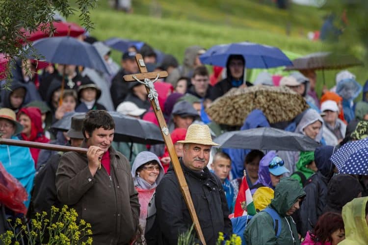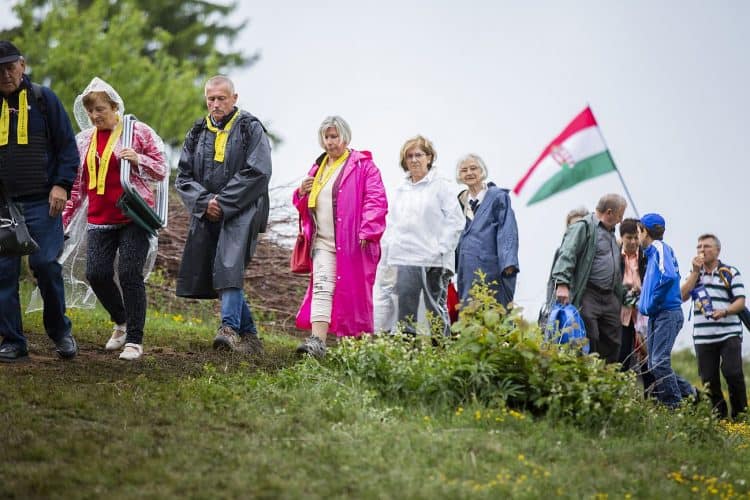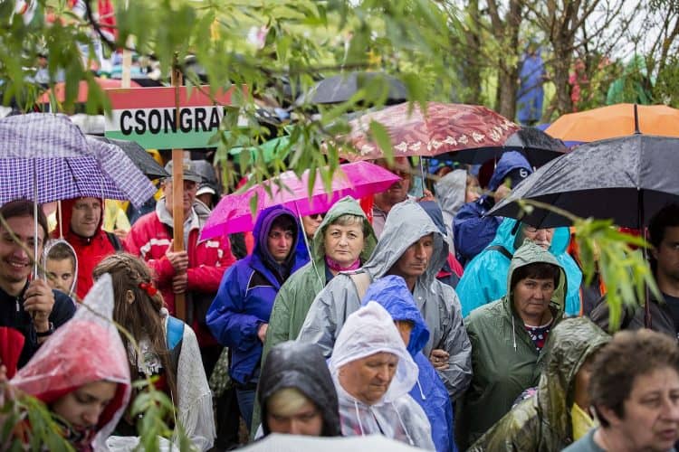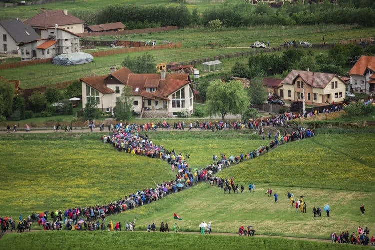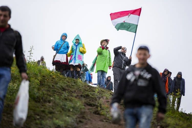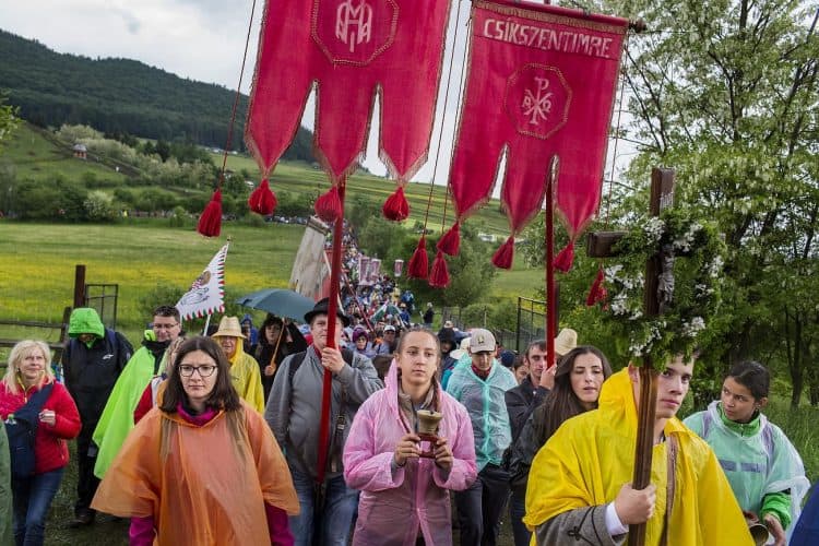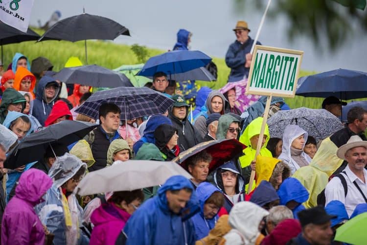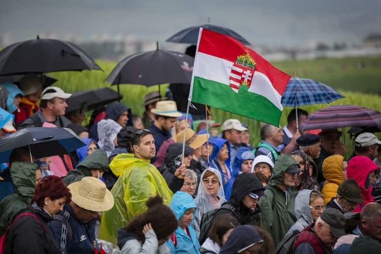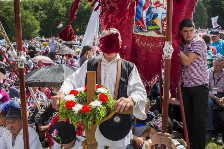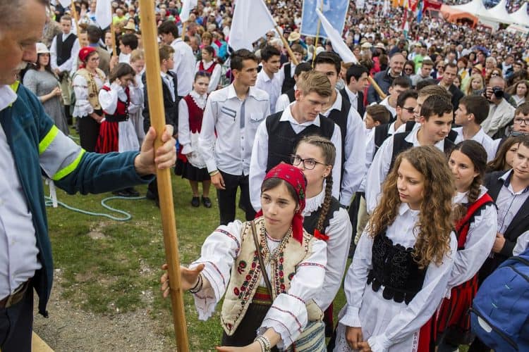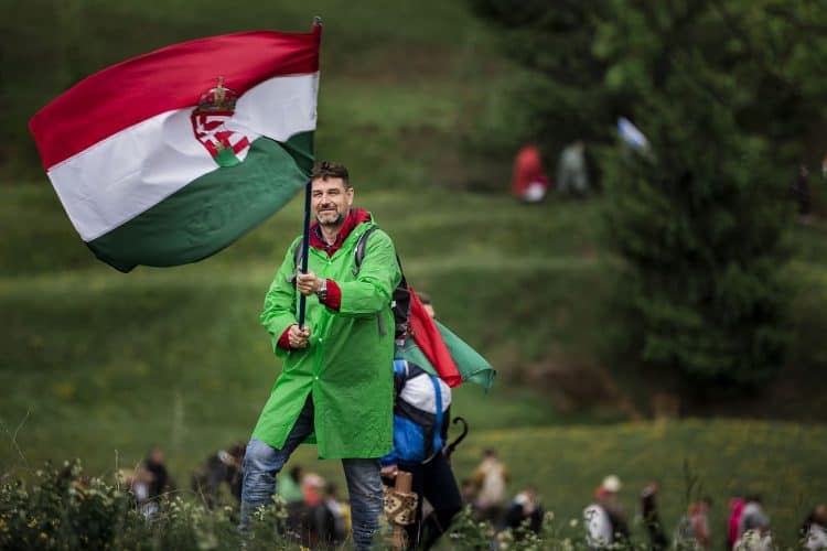 SUMULEU CIUC, ROMANIA - MAY 18: Hungarians from all over the world attending the early pilgrimage hold at Sumuleu Ciuc in Romania, as seen on May 18, 2018. Sumuleu Ciuc became a pilgrimage site in 1567, when Hungarian king John II Sigismund Zpolya wanted to convert the Szkely population of the upper Csk to Protestantism. The Szkelys refused to abandon the Catholic faith and resisted. A battle took place on a nearby field, on Saturday before Pentecost 1567, from which the Szkelys emerged victorious. The monks saw this as a sign of the care of Virgin Mary, and since then, this event has been commemorated by a pilgrimage when the believers gather on Pentecost every year. Beside its religious importance, the pilgrimage has also become a community event demonstrating spiritual unity of Hungarian people living in and outside the historical region of Transylvania. Photography by Mugur Varzariu/Getty Images/Newsweek.