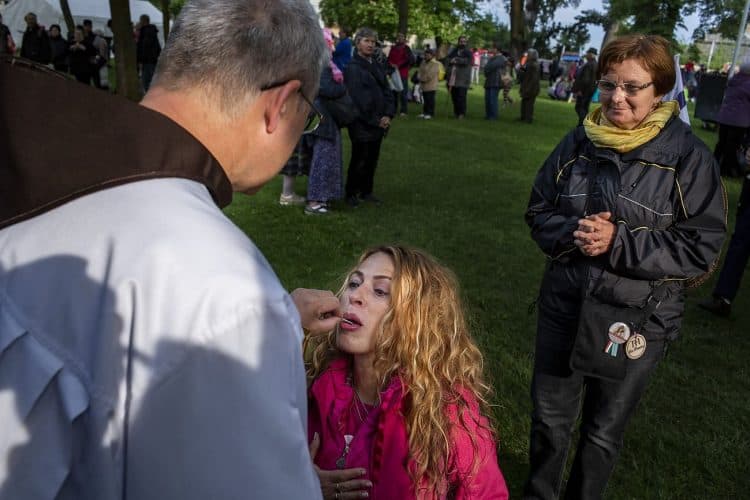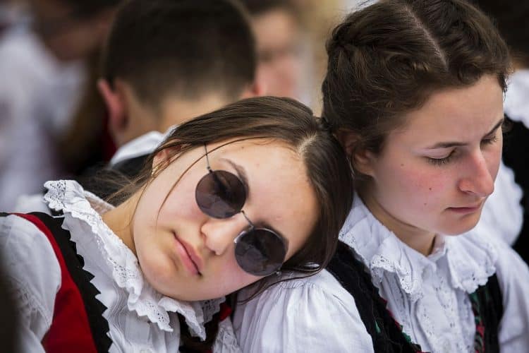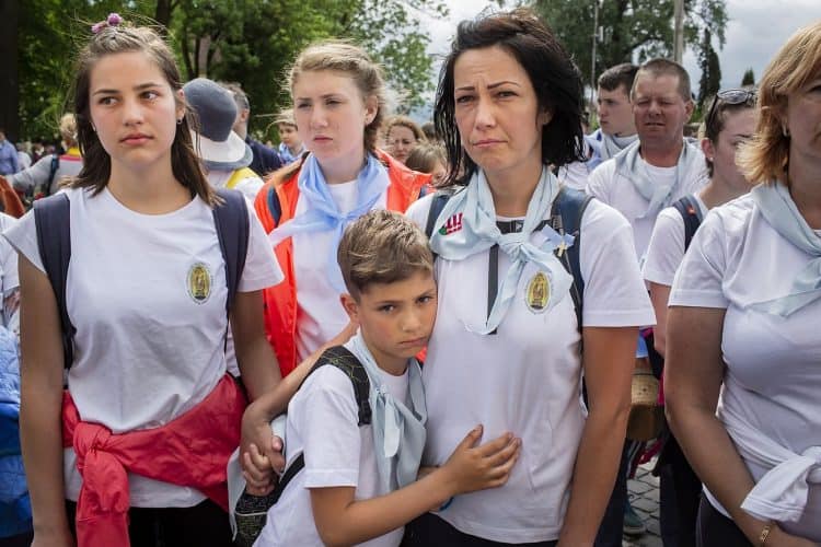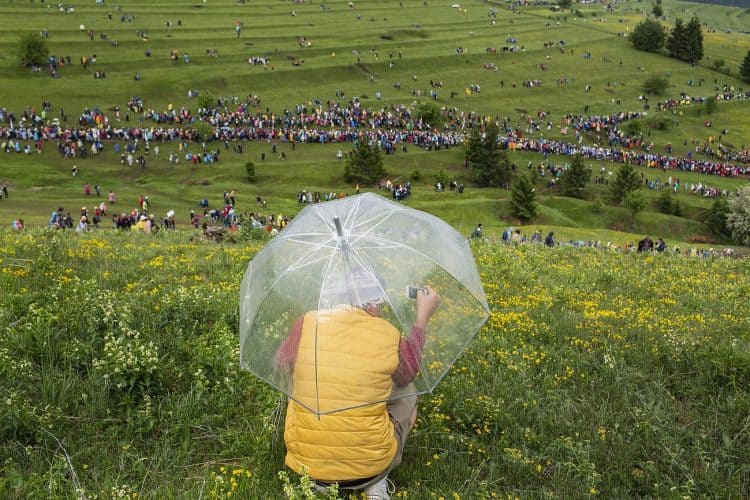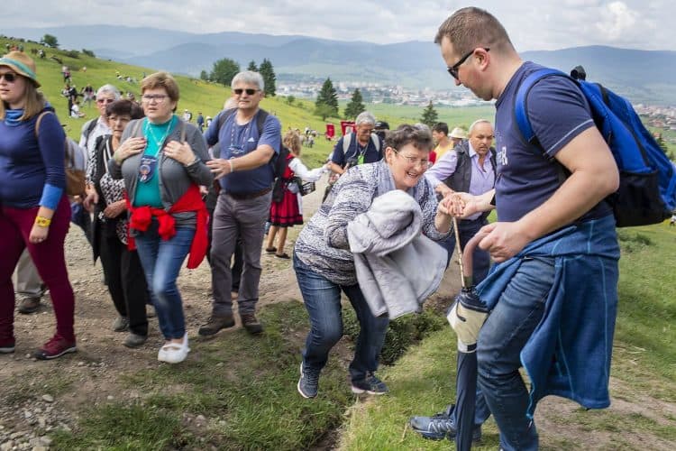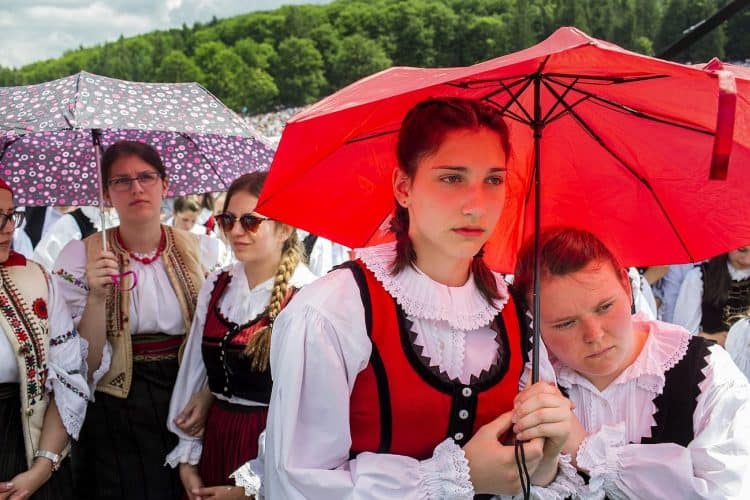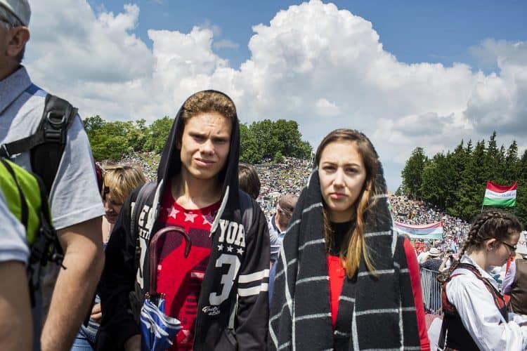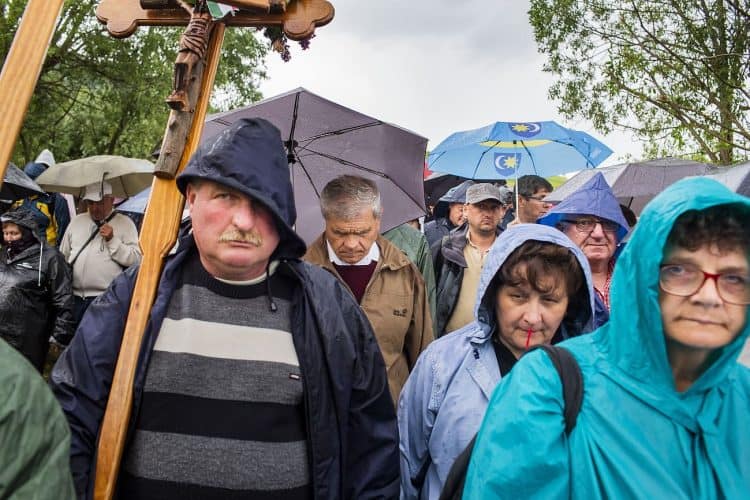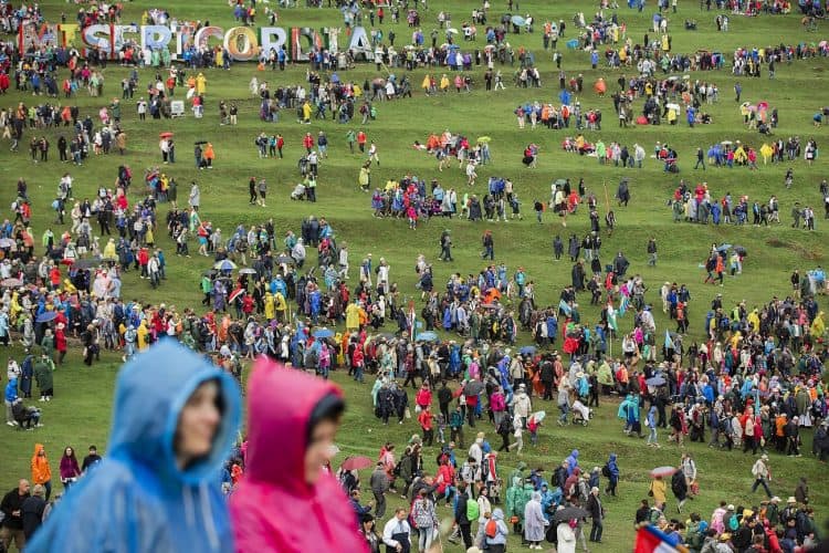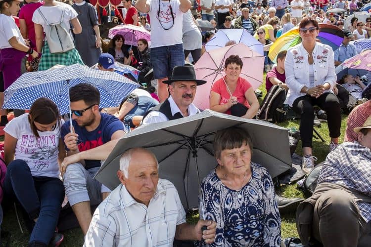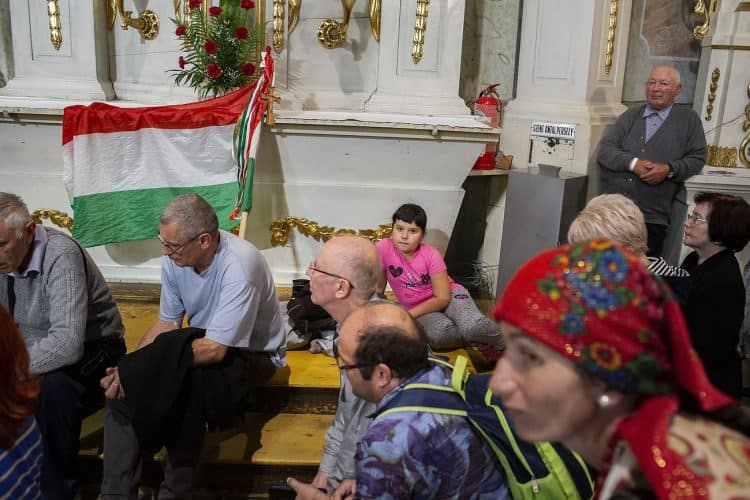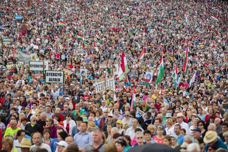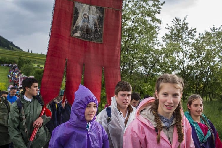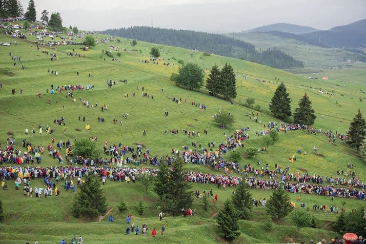 SUMULEU CIUC, ROMANIA - MAY 18: Hungarians from all over the world attending the early pilgrimage hold at Sumuleu Ciuc in Romania, as seen on May 18, 2018. Sumuleu Ciuc became a pilgrimage site in 1567, when Hungarian king John II Sigismund Zpolya wanted to convert the Szkely population of the upper Csk to Protestantism. The Szkelys refused to abandon the Catholic faith and resisted. A battle took place on a nearby field, on Saturday before Pentecost 1567, from which the Szkelys emerged victorious. The monks saw this as a sign of the care of Virgin Mary, and since then, this event has been commemorated by a pilgrimage when the believers gather on Pentecost every year. Beside its religious importance, the pilgrimage has also become a community event demonstrating spiritual unity of Hungarian people living in and outside the historical region of Transylvania. Photography by Mugur Varzariu/Getty Images/Newsweek.