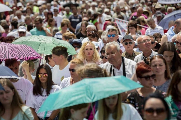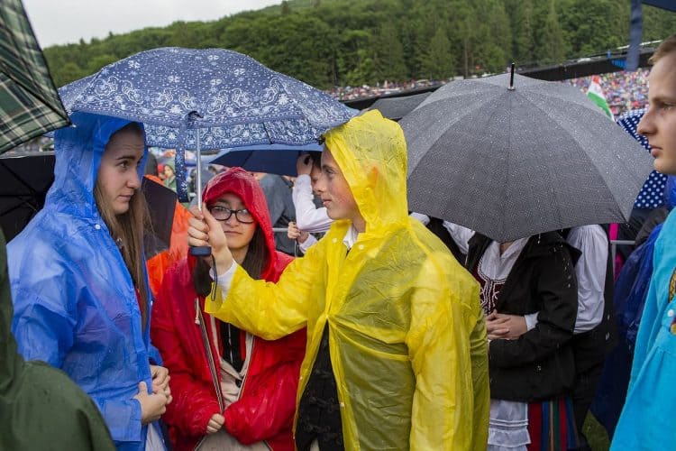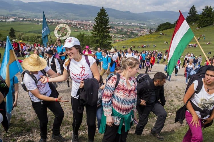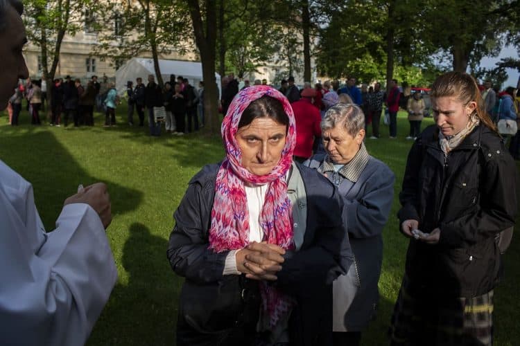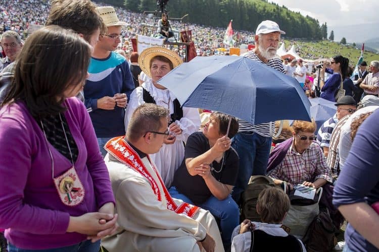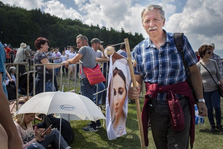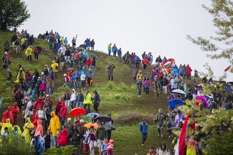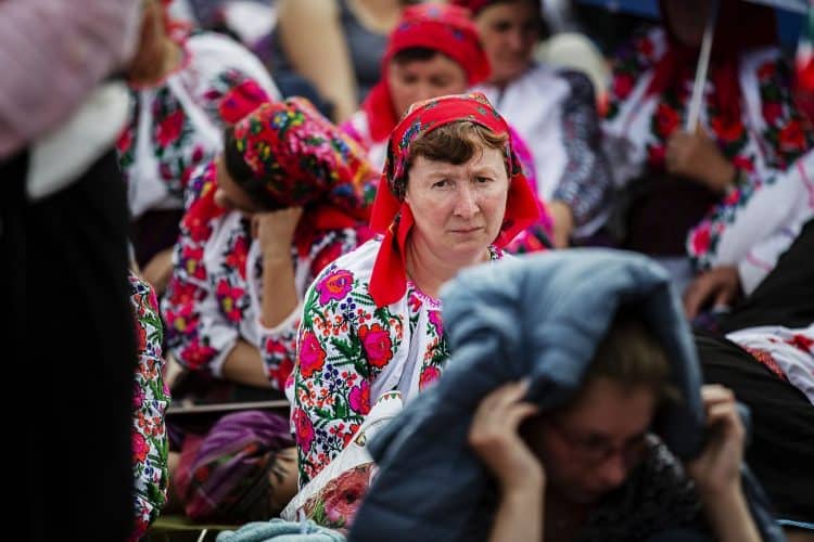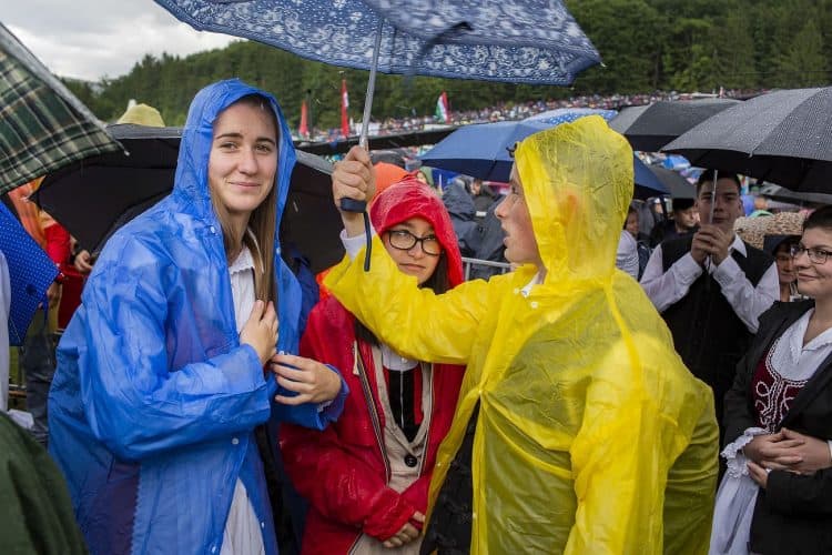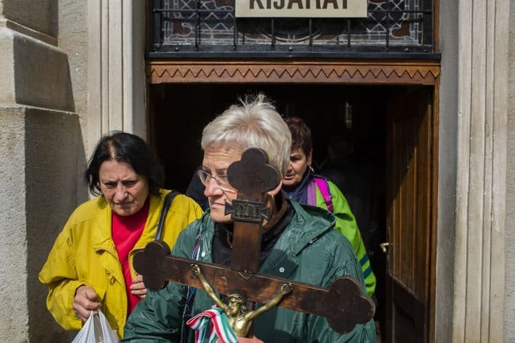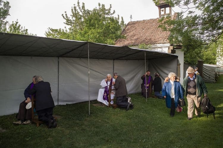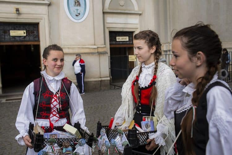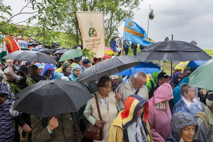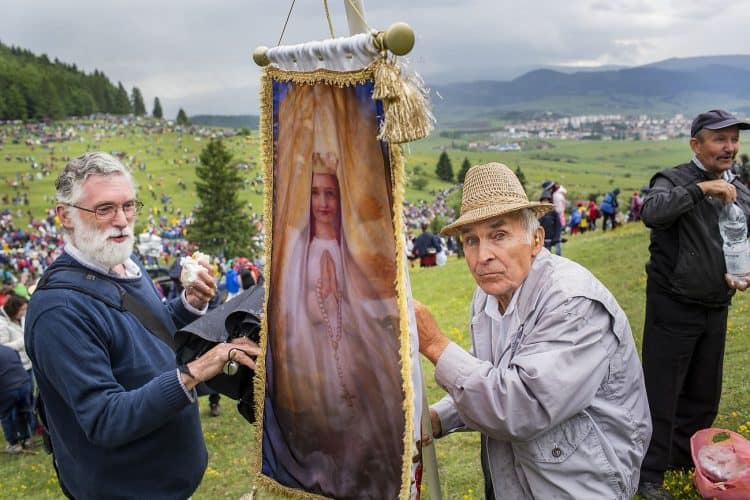 SUMULEU CIUC, ROMANIA - MAY 18: Hungarians from all over the world attending the early pilgrimage hold at Sumuleu Ciuc in Romania, as seen on May 18, 2018. Sumuleu Ciuc became a pilgrimage site in 1567, when Hungarian king John II Sigismund Zpolya wanted to convert the Szkely population of the upper Csk to Protestantism. The Szkelys refused to abandon the Catholic faith and resisted. A battle took place on a nearby field, on Saturday before Pentecost 1567, from which the Szkelys emerged victorious. The monks saw this as a sign of the care of Virgin Mary, and since then, this event has been commemorated by a pilgrimage when the believers gather on Pentecost every year. Beside its religious importance, the pilgrimage has also become a community event demonstrating spiritual unity of Hungarian people living in and outside the historical region of Transylvania. Photography by Mugur Varzariu/Getty Images/Newsweek.