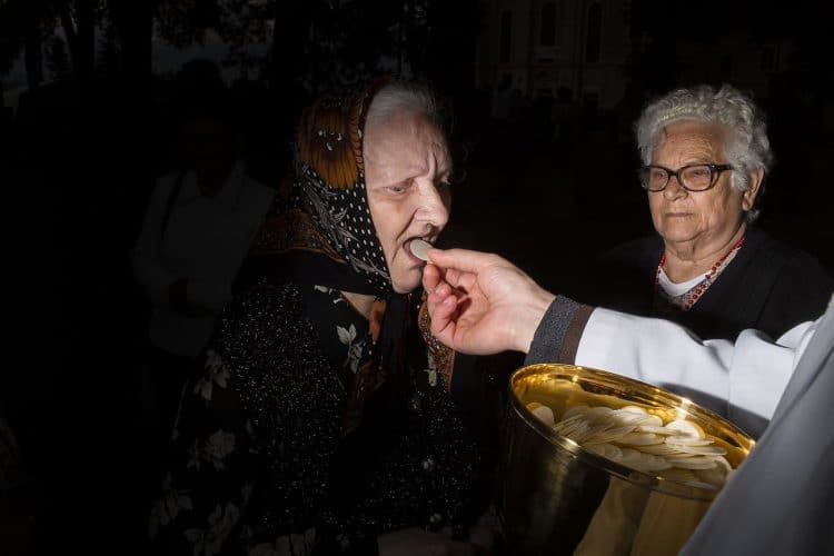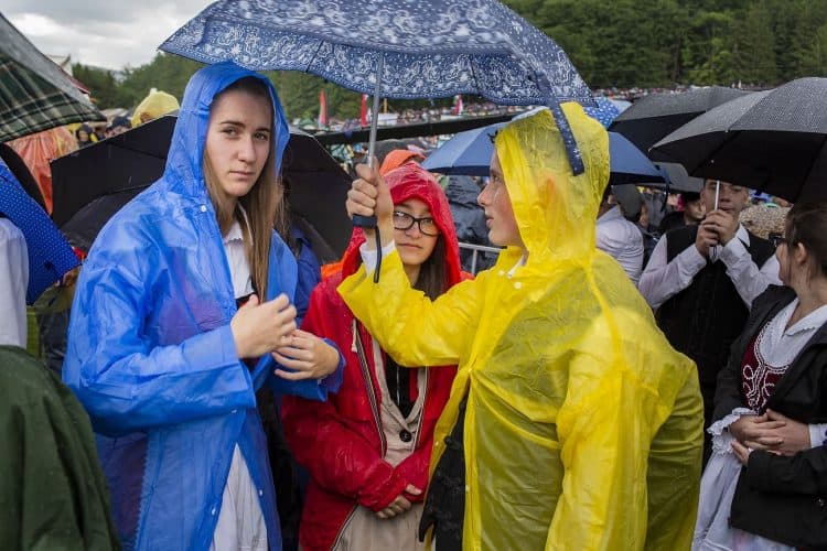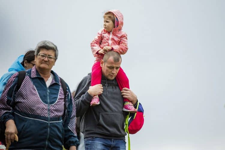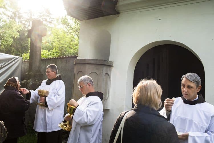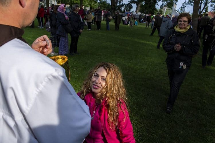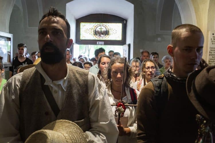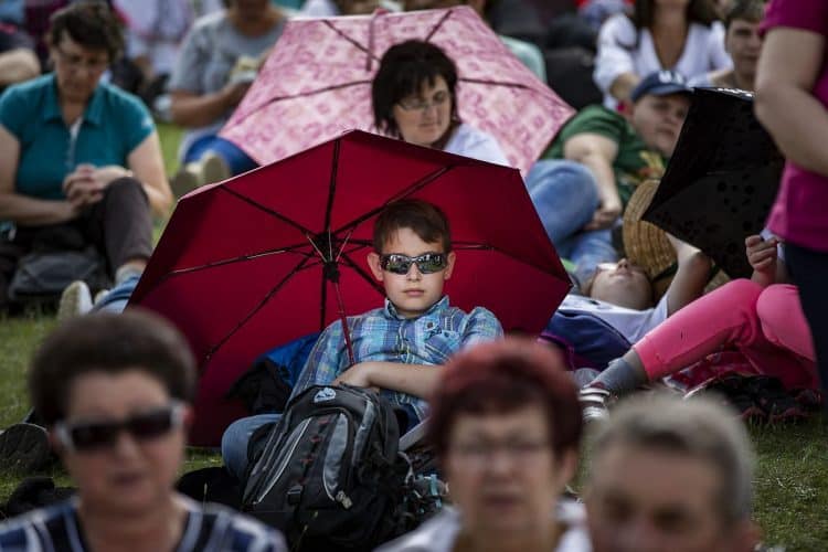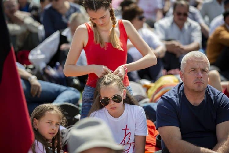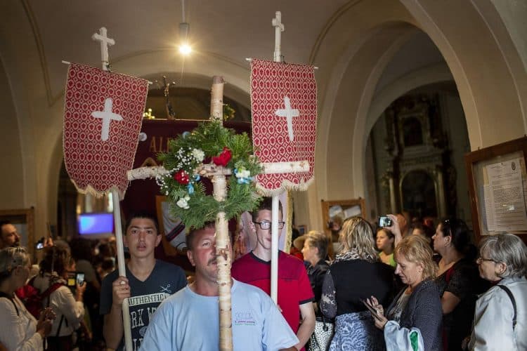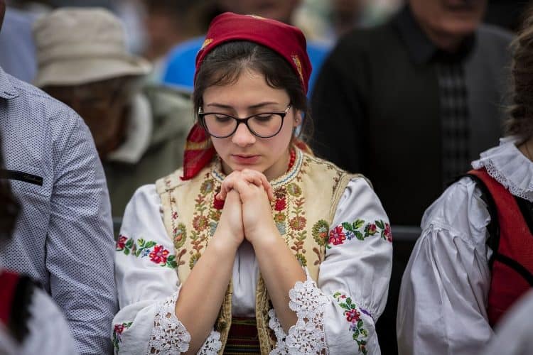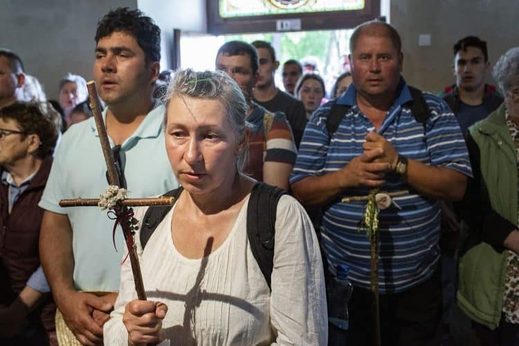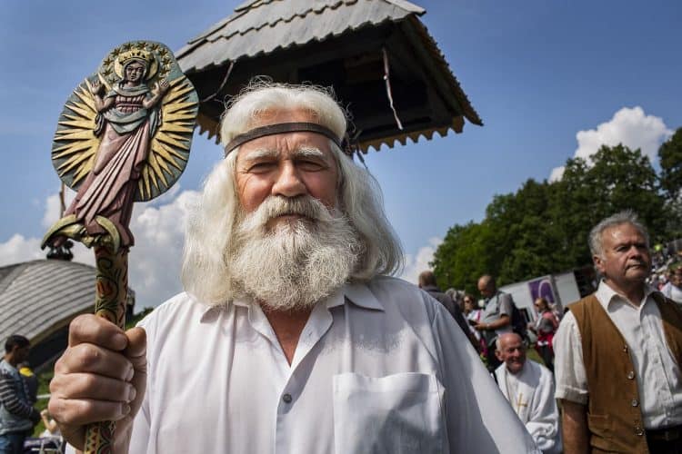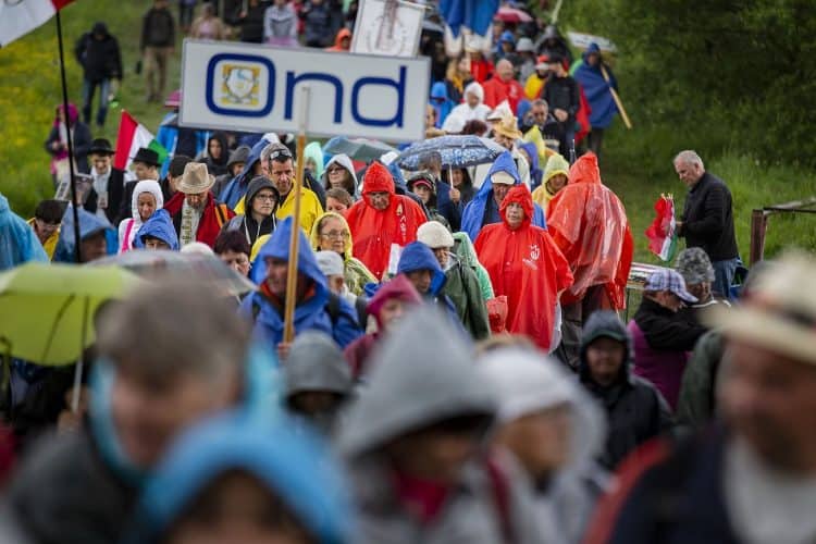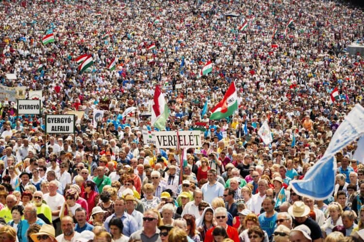 SUMULEU CIUC, ROMANIA - MAY 18: Hungarians from all over the world attending the early pilgrimage hold at Sumuleu Ciuc in Romania, as seen on May 18, 2018. Sumuleu Ciuc became a pilgrimage site in 1567, when Hungarian king John II Sigismund Zpolya wanted to convert the Szkely population of the upper Csk to Protestantism. The Szkelys refused to abandon the Catholic faith and resisted. A battle took place on a nearby field, on Saturday before Pentecost 1567, from which the Szkelys emerged victorious. The monks saw this as a sign of the care of Virgin Mary, and since then, this event has been commemorated by a pilgrimage when the believers gather on Pentecost every year. Beside its religious importance, the pilgrimage has also become a community event demonstrating spiritual unity of Hungarian people living in and outside the historical region of Transylvania. Photography by Mugur Varzariu/Getty Images/Newsweek.