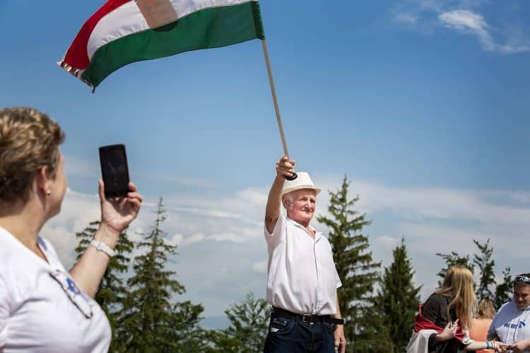 SUMULEU CIUC, ROMANIA - MAY 19: Hungarians from all over the world attending the early pilgrimage hold at Sumuleu Ciuc in Romania, as seen on May 19, 2018. Sumuleu Ciuc became a pilgrimage site in 1567, when Hungarian king John II Sigismund Zápolya wanted to convert the Székely population of the upper Csík to Protestantism. The Székelys refused to abandon the Catholic faith and resisted. A battle took place on a nearby field, on Saturday before Pentecost 1567, from which the Székelys emerged victorious. The monks saw this as a sign of the care of Virgin Mary, and since then, this event has been commemorated by a pilgrimage when the believers gather on Pentecost every year. Beside its religious importance, the pilgrimage has also become a community event demonstrating spiritual unity of Hungarian people living in and outside the historical region of Transylvania. Photography by Mugur Varzariu/Getty Images/Newsweek.