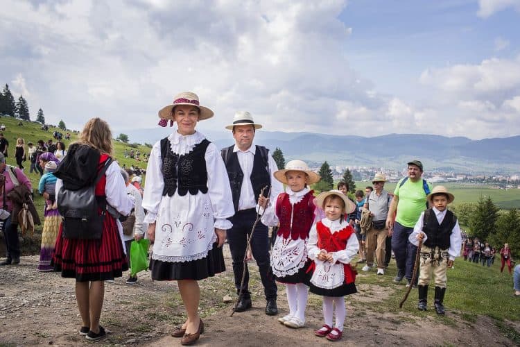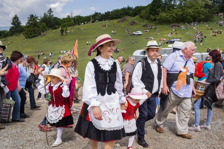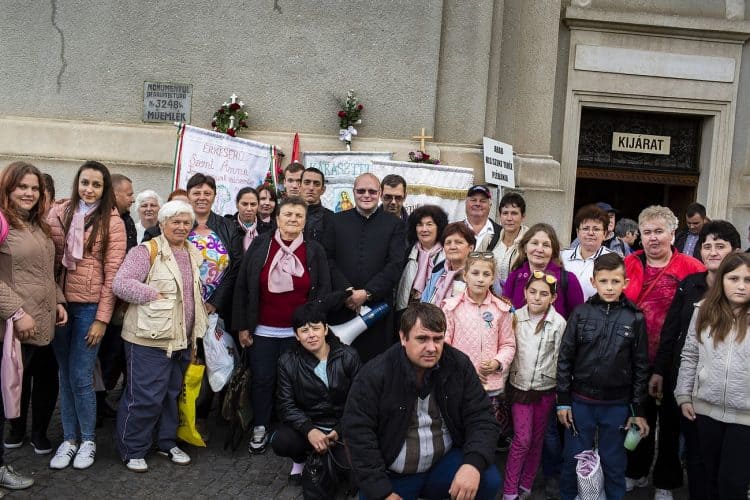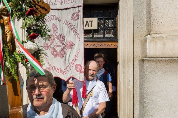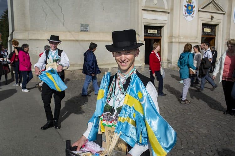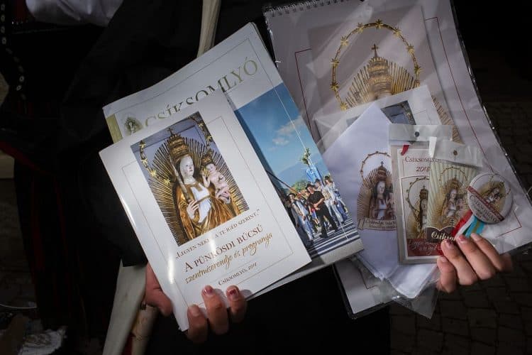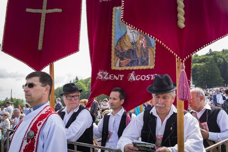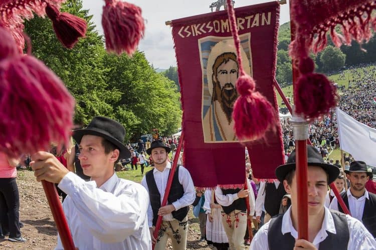 SUMULEU CIUC, ROMANIA - MAY 19: Hungarians from all over the world attending the early pilgrimage hold at Sumuleu Ciuc in Romania, as seen on May 19, 2018. Sumuleu Ciuc became a pilgrimage site in 1567, when Hungarian king John II Sigismund Zápolya wanted to convert the Székely population of the upper Csík to Protestantism. The Székelys refused to abandon the Catholic faith and resisted. A battle took place on a nearby field, on Saturday before Pentecost 1567, from which the Székelys emerged victorious. The monks saw this as a sign of the care of Virgin Mary, and since then, this event has been commemorated by a pilgrimage when the believers gather on Pentecost every year. Beside its religious importance, the pilgrimage has also become a community event demonstrating spiritual unity of Hungarian people living in and outside the historical region of Transylvania. © Mugur Varzariu