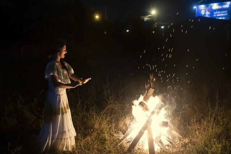 The crowns are thrown over the houses, and whenever the crown falls, it is said that someone will die in that house; if the crown stays on the roof of the house, then good harvest and wealth will be bestowed upon the owners. As with other bonfire celebrations, jumping over the embers after the bonfire is not raging anymore is done to purify the person and also to bring health.