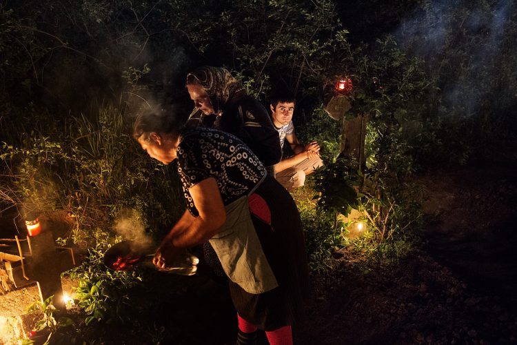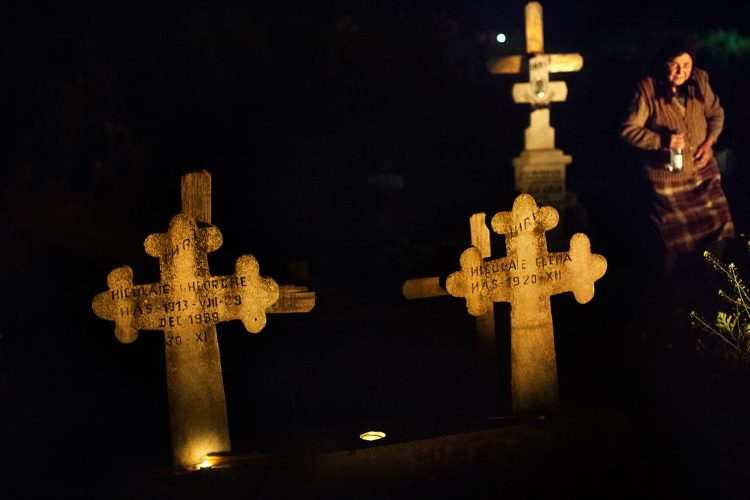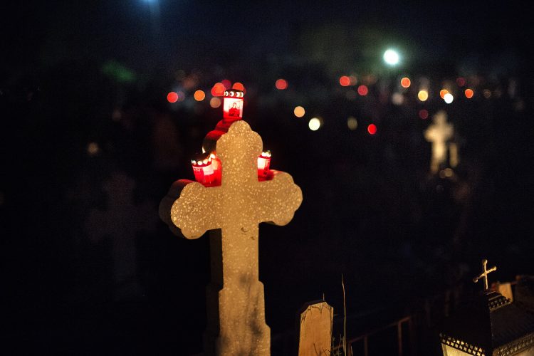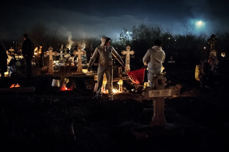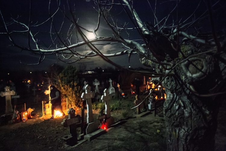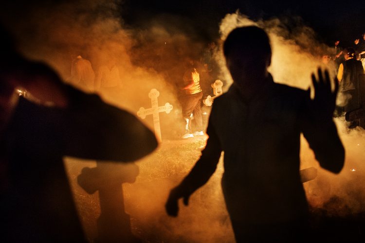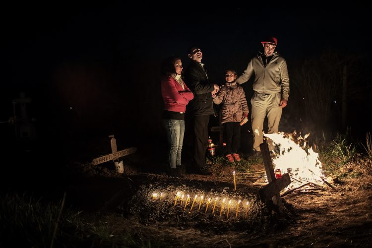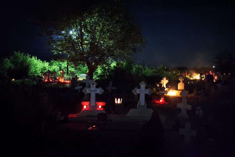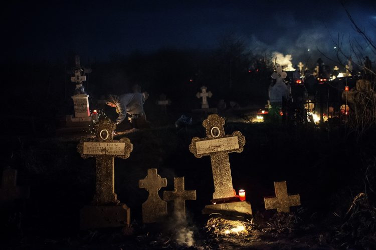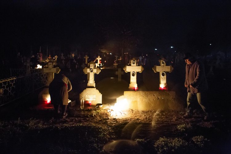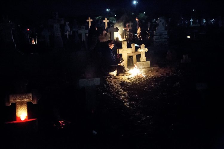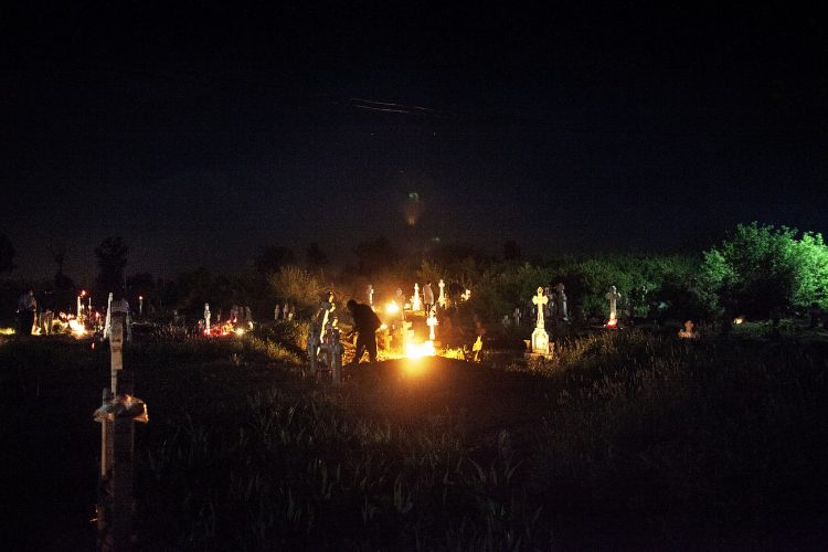 Romanians visit a cemetery during a Palm Sunday memorial for the departed in Herasti, southern Romania, late Saturday, April 23, 2016. Orthodox believers in the village gather at midnight, light fires at the graves and share food in memory of their dead relatives.