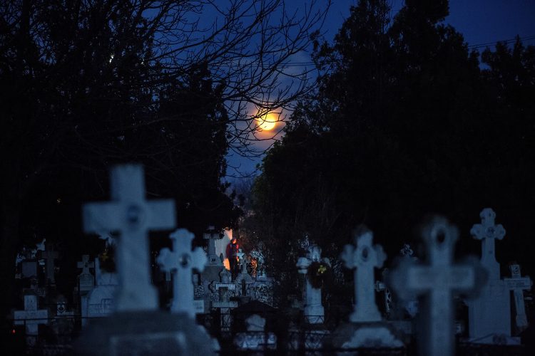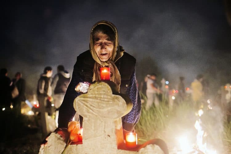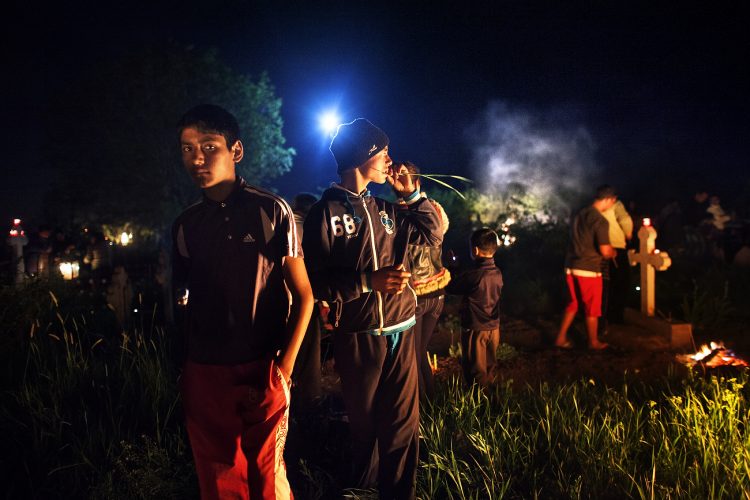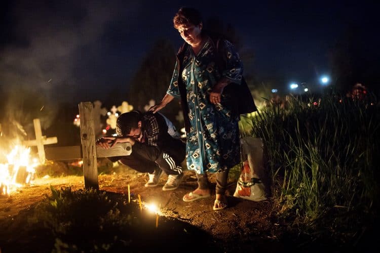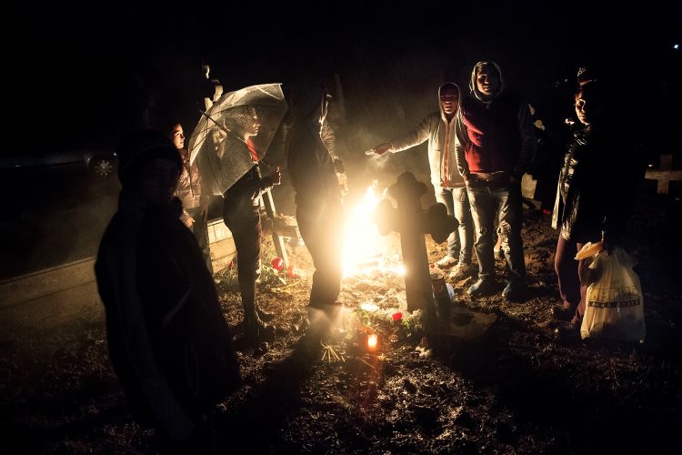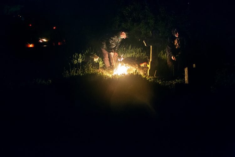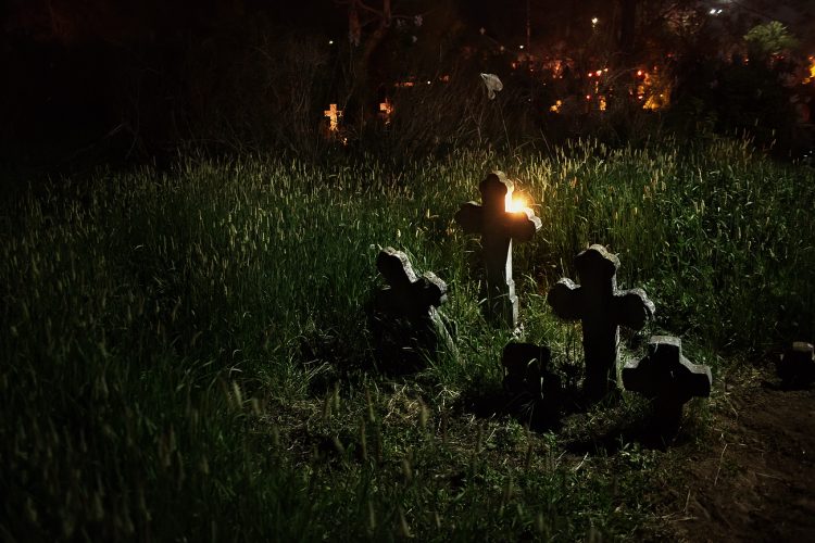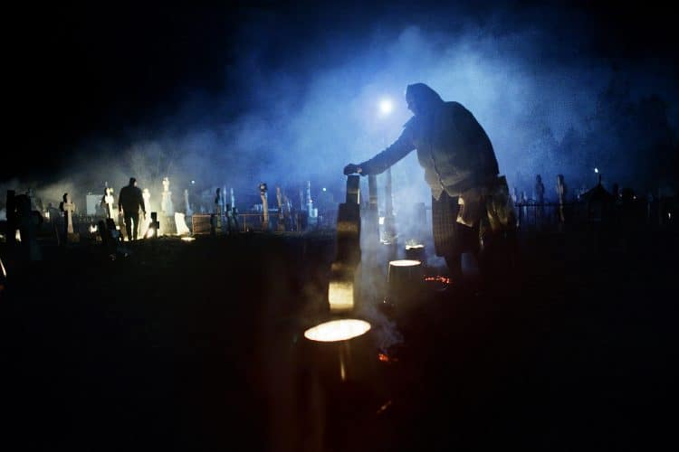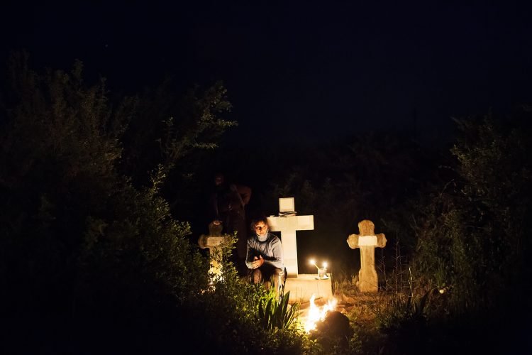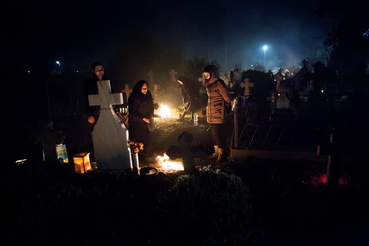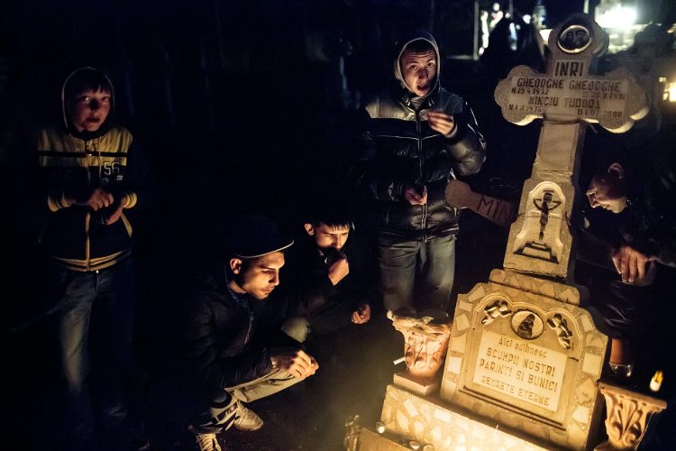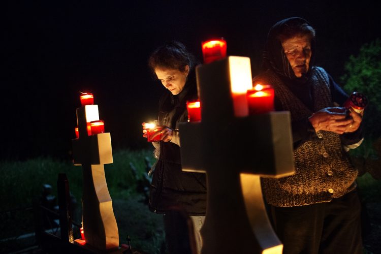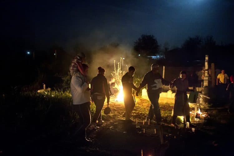 Romanians visit a cemetery during a Palm Sunday memorial for the departed in Herasti, southern Romania, late Saturday, April 23, 2016. Orthodox believers in the village gather at midnight, light fires at the graves and share food in memory of their dead relatives.