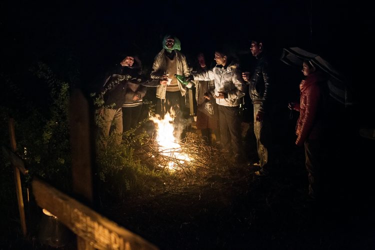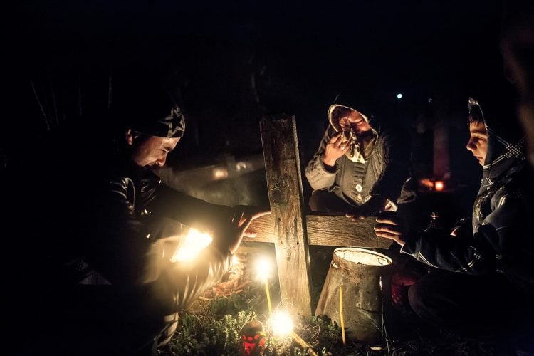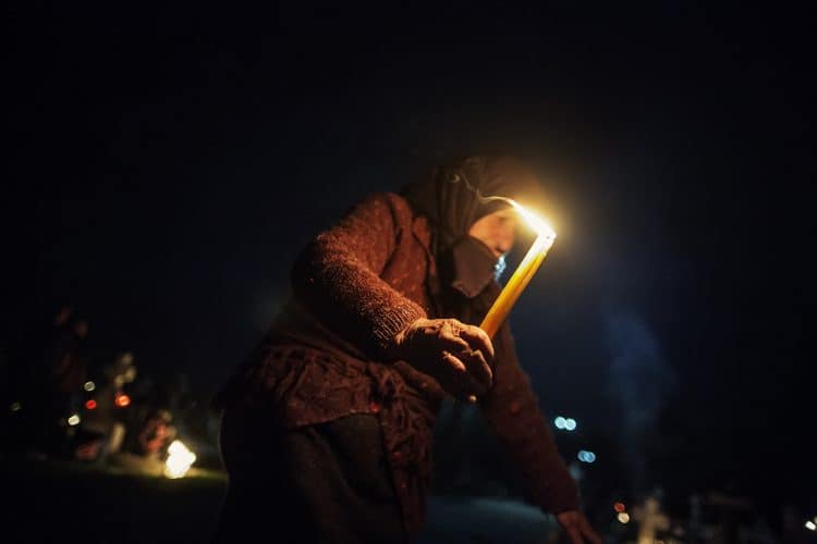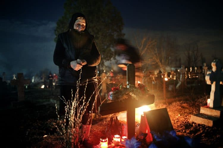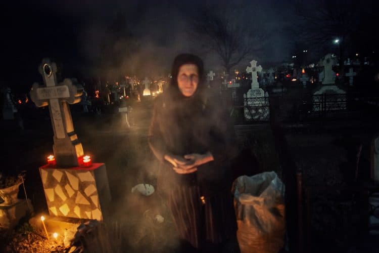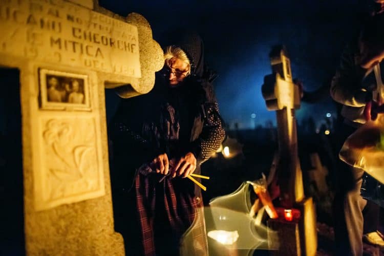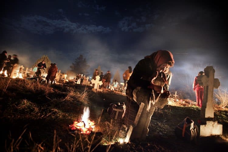 Romanians visit a cemetery during a Palm Sunday memorial for the departed in Herasti, southern Romania, late Saturday, April 5, 2015. Orthodox believers in the village gather at midnight, light fires at the graves and share food in memory of their dead relatives.