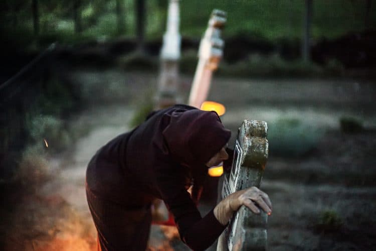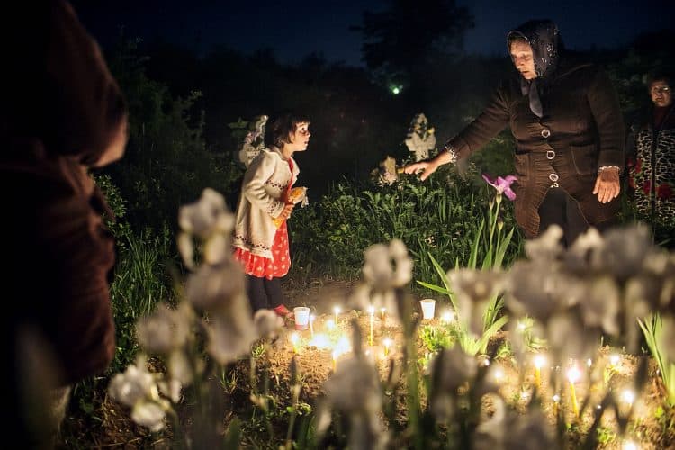Romanians visit a cemetery during a Palm Sunday memorial for the departed in Herasti, southern Romania, early Sunday, April 28, 2013. Orthodox believers in the village gather at midnight, light fires at the graves and share food in memory of their dead relatives.