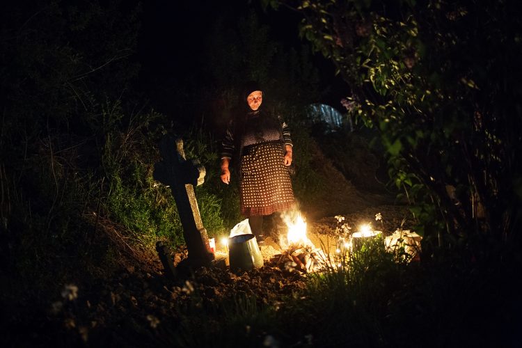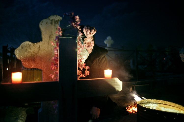 HERASTI, ROMANIA - APR 23: Woman reacts at the grave of her late husband during a Palm Sunday memorial for the departed in Herasti, southern Romania, late Saturday, April 23, 2016. Orthodox believers in the village gather at midnight, light fires at the graves and share food in memory of their dead relatives. © Mugur Varzariu