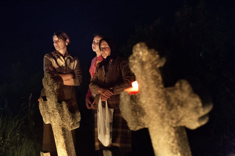 Romanians visit a cemetery during a Palm Sunday memorial for the departed in Herasti, southern Romania, late Saturday, April 4, 2015. Orthodox believers in the village gather at midnight, light fires at the graves and share food in memory of their dead relatives.