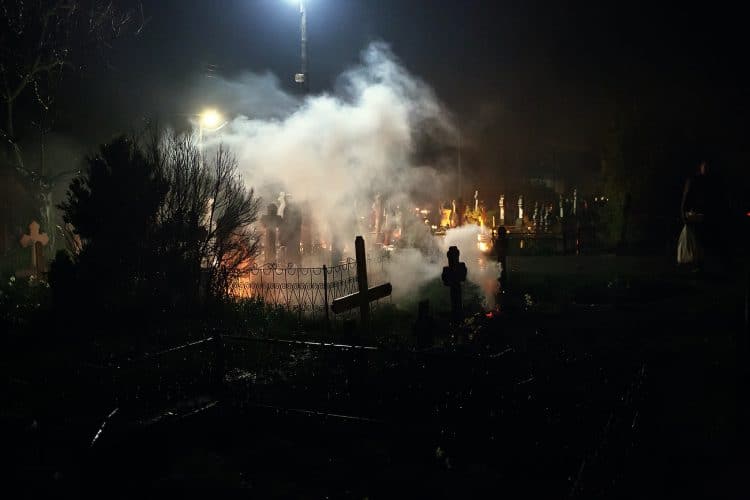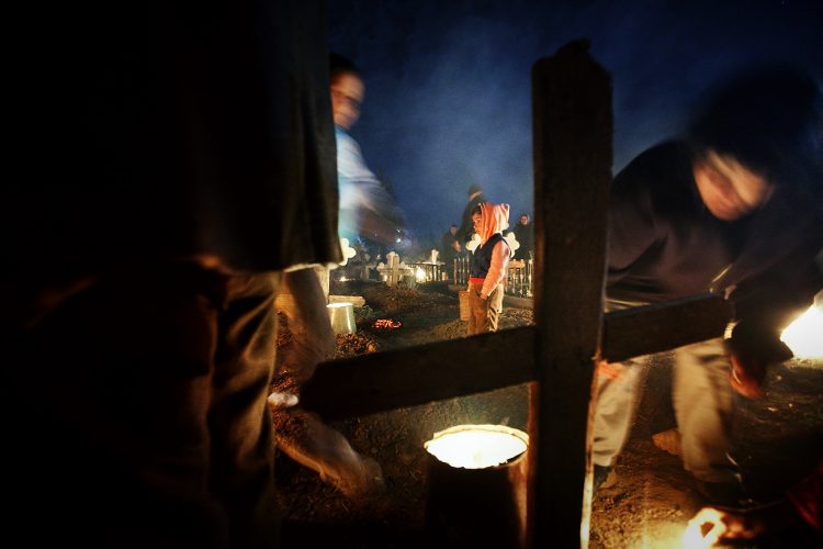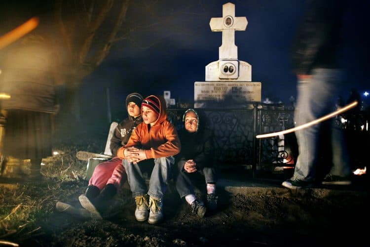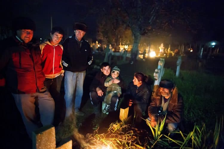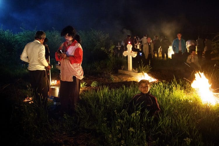 Romanians visit a cemetery during a Palm Sunday memorial for the departed in Herasti, southern Romania, late Saturday, April 27, 2013. Orthodox believers in the village gather at midnight, light fires at the graves and share food in memory of their dead relatives.