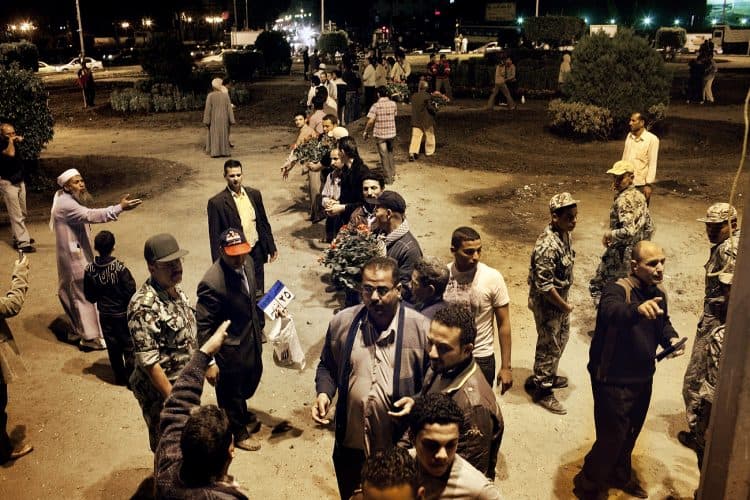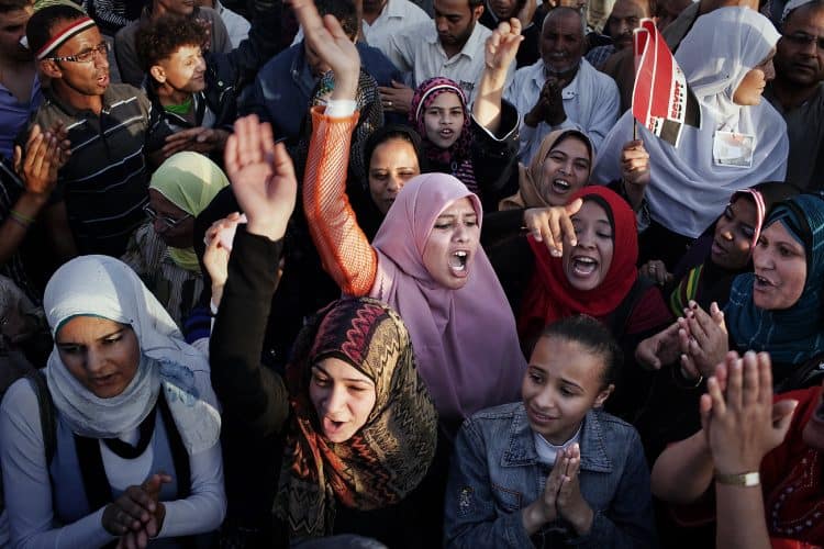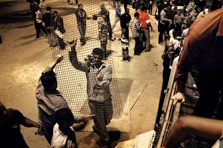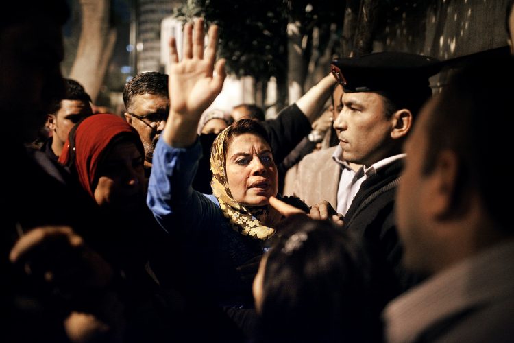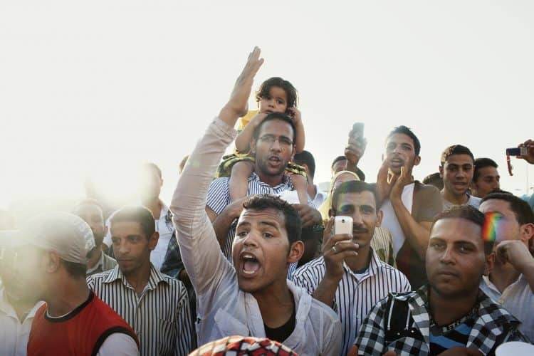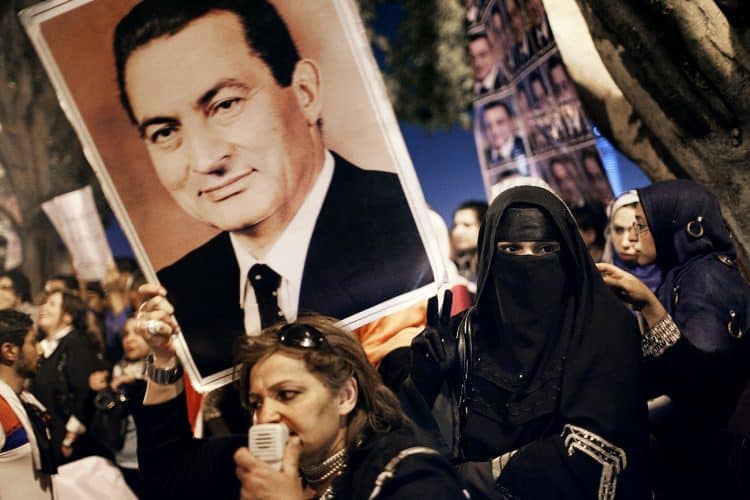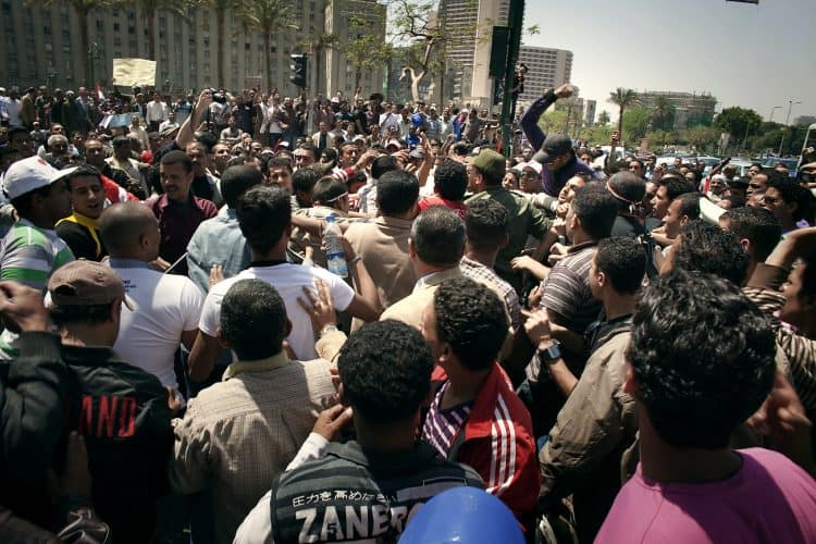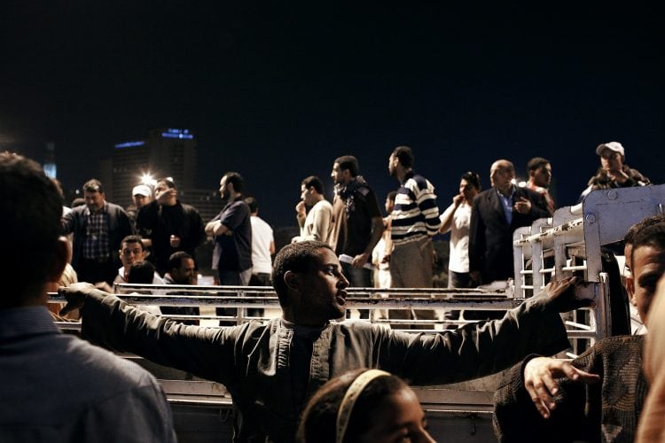 People shouting slogans during a pro Mubarak rally in front of the state television headquarters (not seen in the image) in Cairo.