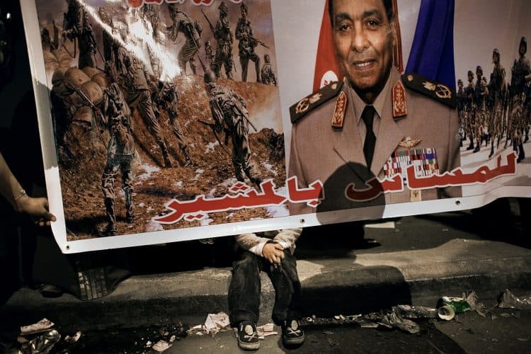 Kid seen at a pro Mubarak rally in front of the state television headquarters (not seen in the image) in Cairo. The poster covering the kid, praises MubarakÕs military campaigns.