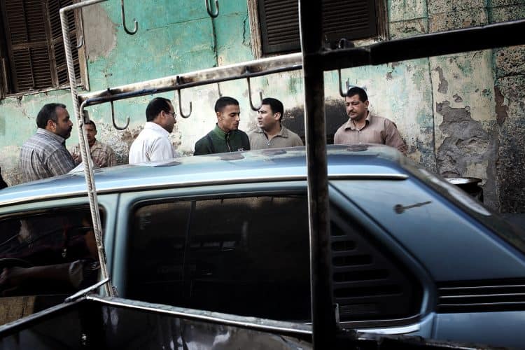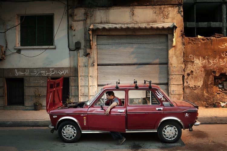 Egyptian works on his car in front of a closed store, as seen in Cairo on April 14, 2011.