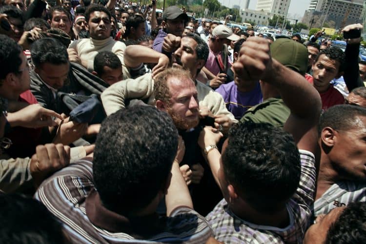 Allegedly israeli man, wearing a woman vail, caught and beaten by the protestants in Tahrir Square, according to military official. He was rescued by the MP and move to safety at the Cairo Museum front entrance, as seen on April 15, 2011.