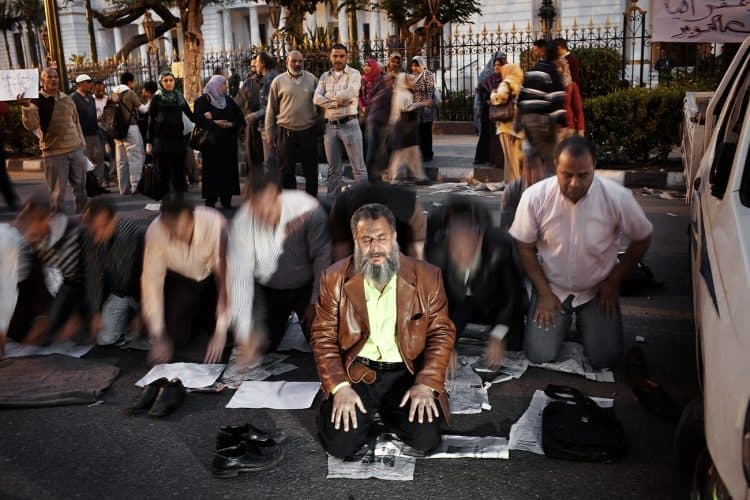 People pray during a protest against the proposed layoffs in front of the Prime Minister offices in Cairo, April 14, 2011.