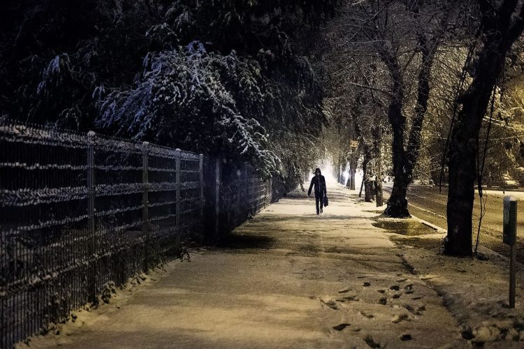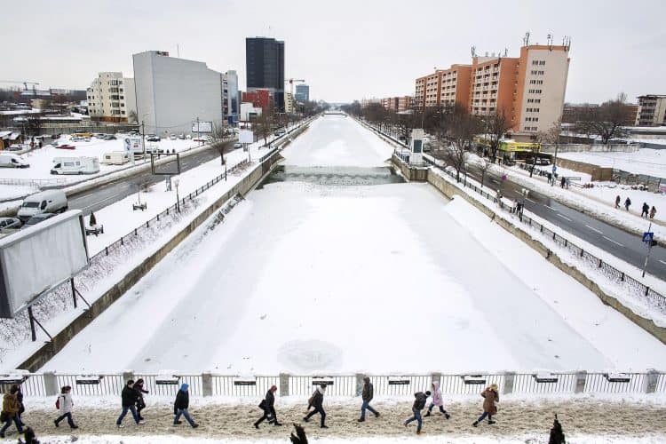 People walking by, near Regie, a university campus in Bucharest on January 30, 2014. Weather forecasters issued a code red severe weather warning as a second wave of blizzards affects the southeastern regions of Romania disrupting road and rail traffic.