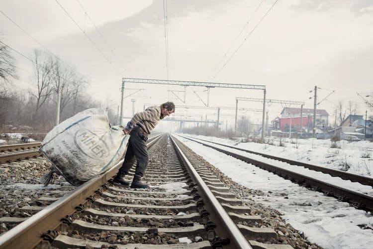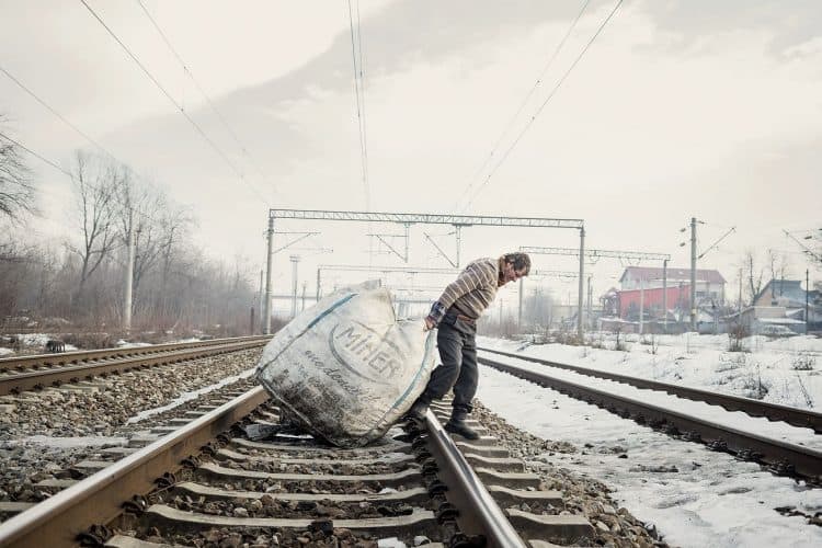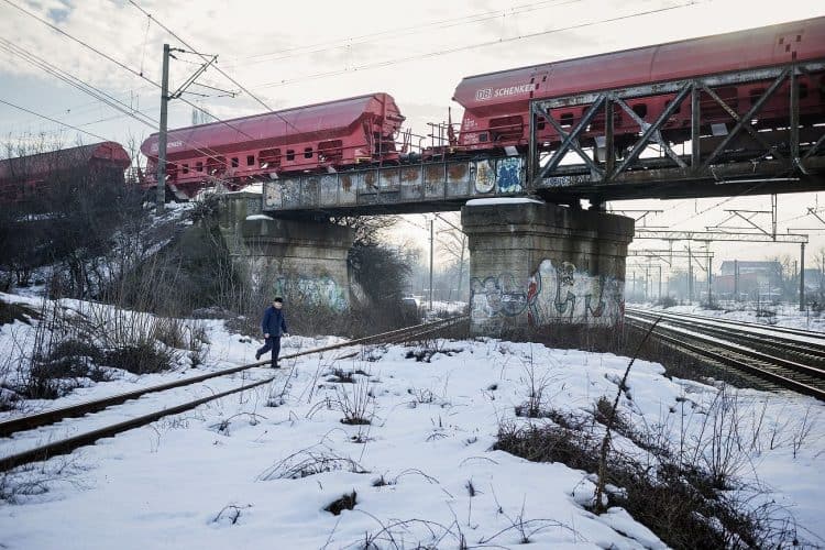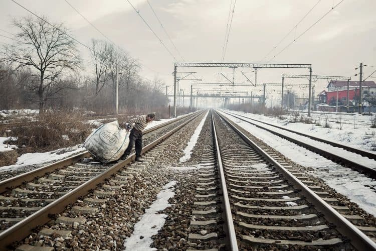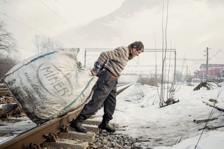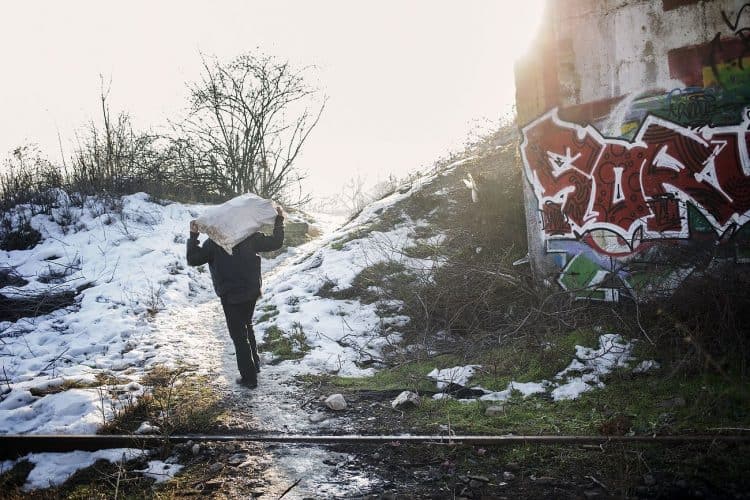 Roma man pulling a trolley as seen inside Vacaresti pit in Bucharest on December 29, 2014. During Ceausescu regime the Vacaresti area, which was accommodating a 17th century monastery and a district of houses with big gardens, was demolished in order to build a lake. Since the works were abandoned in Õ88 nothing has been done here. In the presence of surfaced underground springs and plenty of time, mother nature has shape shifted the pit into a green oasis with delta like particularities where a variety of flora and fauna have blossomed. Starting 15 years ago many poor families, mainly Roma, have found shelter in the pit since the land property is still in dispute between the state and the former owners of the demolished houses. They all live in improvised shacks made from scraps they gather in the neighborhood. Those people are most resourceful when it comes to improvisation of what actually constitutes their life.