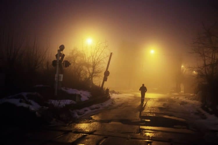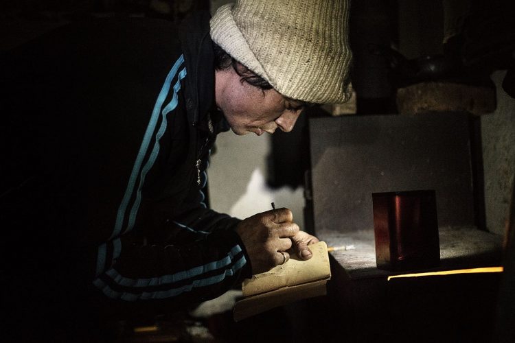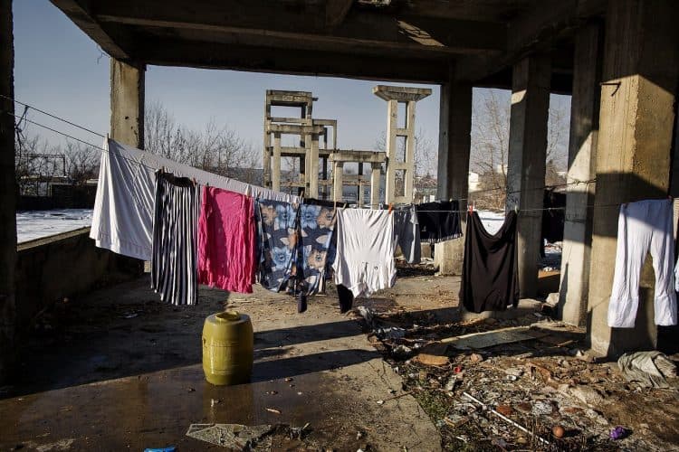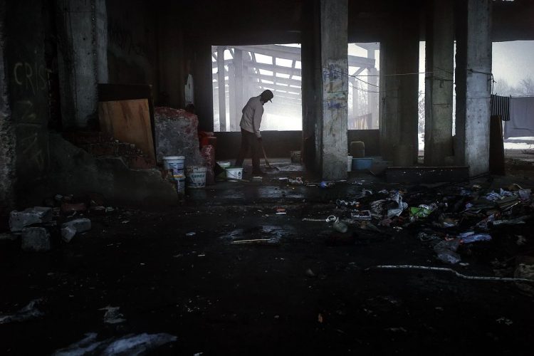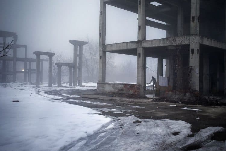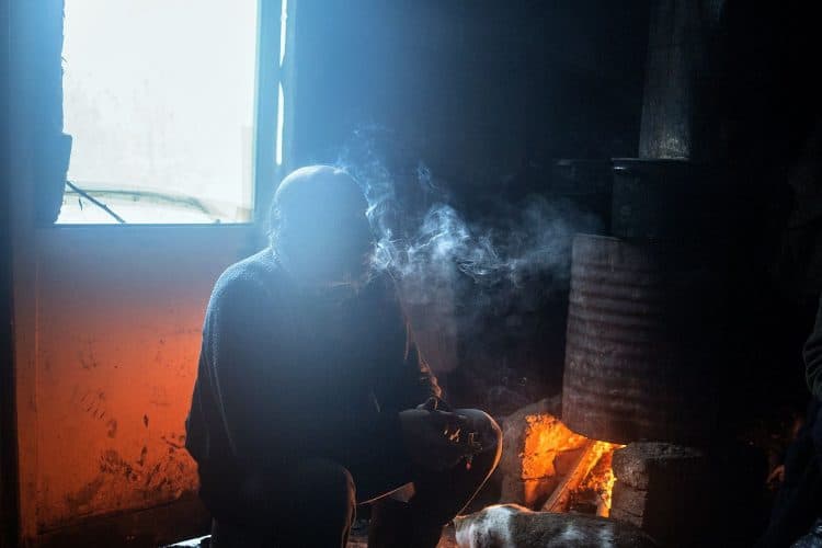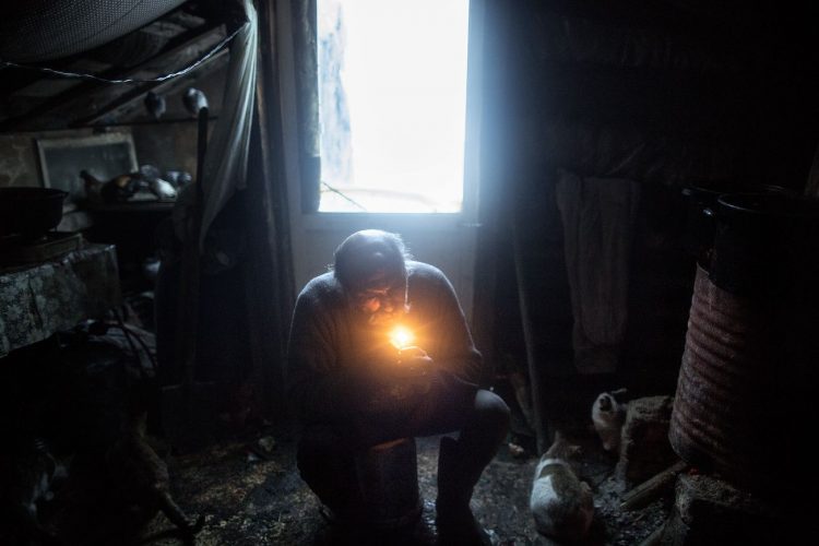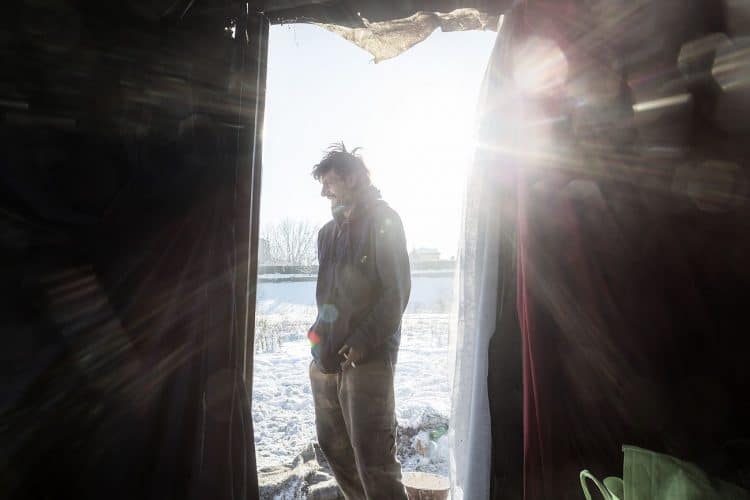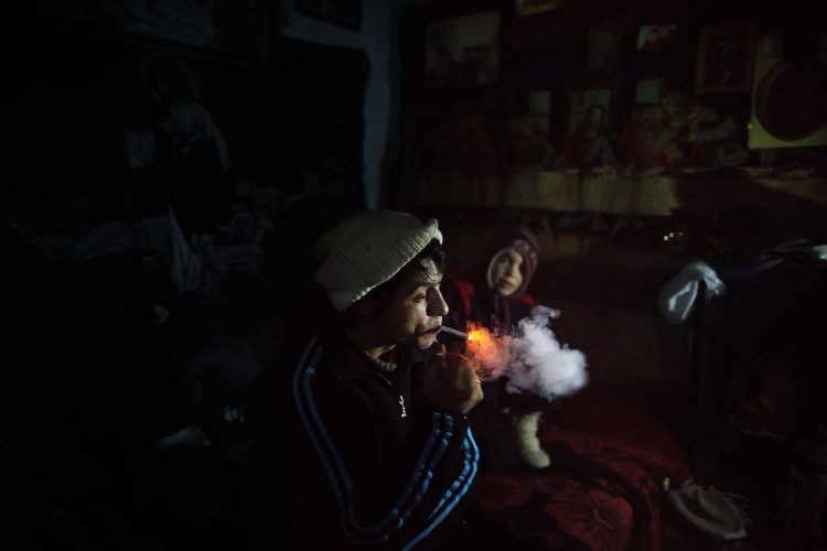 Roma man smoking inside a ramshackle dwelling inside Vacaresti pit in Bucharest on December 29, 2014.