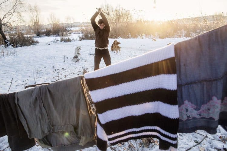 Roma people as seen inside Vacaresti pit in Bucharest on December 31, 2014. During Ceausescu regime the Vacaresti area, which was accommodating a 17th century monastery and a district of houses with big gardens, was demolished in order to build a lake. Since the works were abandoned in 1988 nothing has been done here. In the presence of surfaced underground springs and plenty of time, mother nature has shape shifted the pit into a green oasis with delta like particularities where a variety of flora and fauna have blossomed. Starting 15 years ago many poor families, mainly Roma, have found shelter in the pit since the land property is still in dispute between the state and the former owners of the demolished houses. They all live in improvised shacks made from scraps they gather in the neighborhood. Those people are most resourceful when it comes to improvisation of what actually constitutes their life.