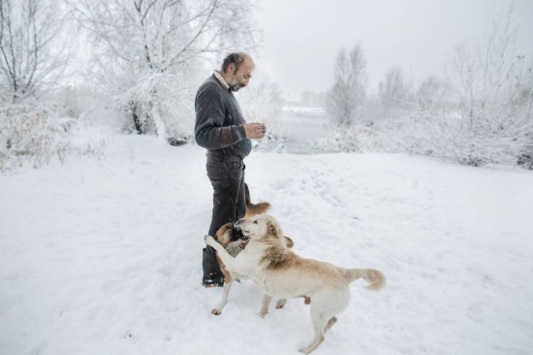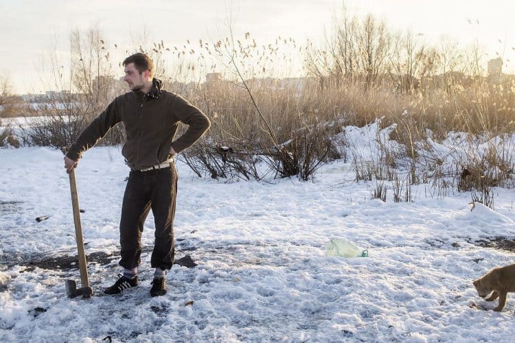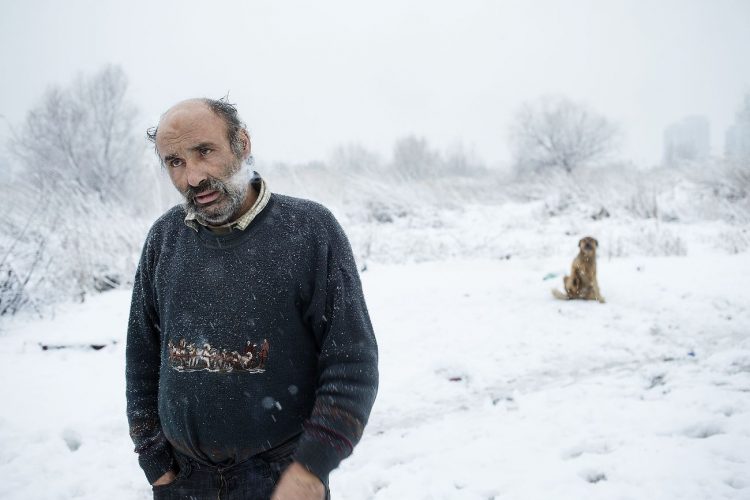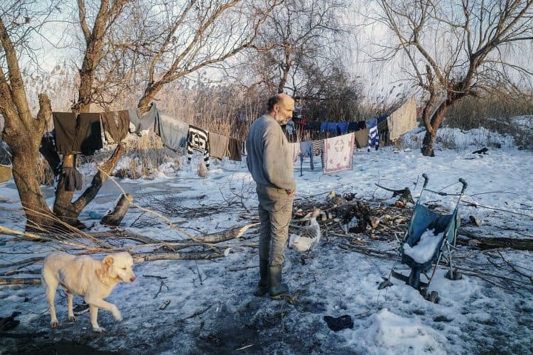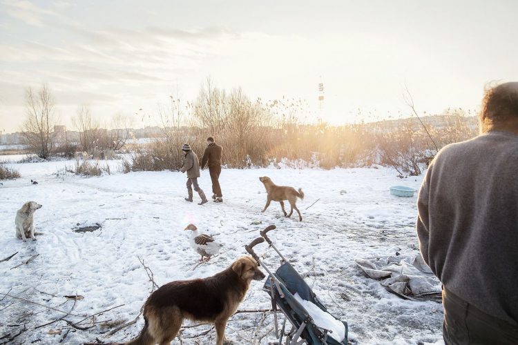 Roma man with his dogs as seen inside Vacaresti pit in Bucharest on December 29, 2014. During Ceausescu regime the Vacaresti area, which was accommodating a 17th century monastery and a district of houses with big gardens, was demolished in order to build a lake. Since the works were abandoned in Õ88 nothing has been done here. In the presence of surfaced underground springs and plenty of time, mother nature has shape shifted the pit into a green oasis with delta like particularities where a variety of flora and fauna have blossomed. Starting 15 years ago many poor families, mainly Roma, have found shelter in the pit since the land property is still in dispute between the state and the former owners of the demolished houses. They all live in improvised shacks made from scraps they gather in the neighborhood. Those people are most resourceful when it comes to improvisation of what actually constitutes their life.