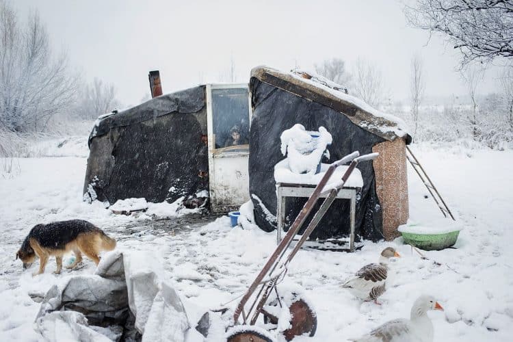 Roma kid in the doorway of a ramshackle dwelling as seen inside Vacaresti pit in Bucharest on December 29, 2014. During Ceausescu regime the Vacaresti area, which was accommodating a 17th century monastery and a district of houses with big gardens, was demolished in order to build a lake. Since the works were abandoned in Õ88 nothing has been done here. In the presence of surfaced underground springs and plenty of time, mother nature has shape shifted the pit into a green oasis with delta like particularities where a variety of flora and fauna have blossomed. Starting 15 years ago many poor families, mainly Roma, have found shelter in the pit since the land property is still in dispute between the state and the former owners of the demolished houses. They all live in improvised shacks made from scraps they gather in the neighborhood. Those people are most resourceful when it comes to improvisation of what actually constitutes their life.