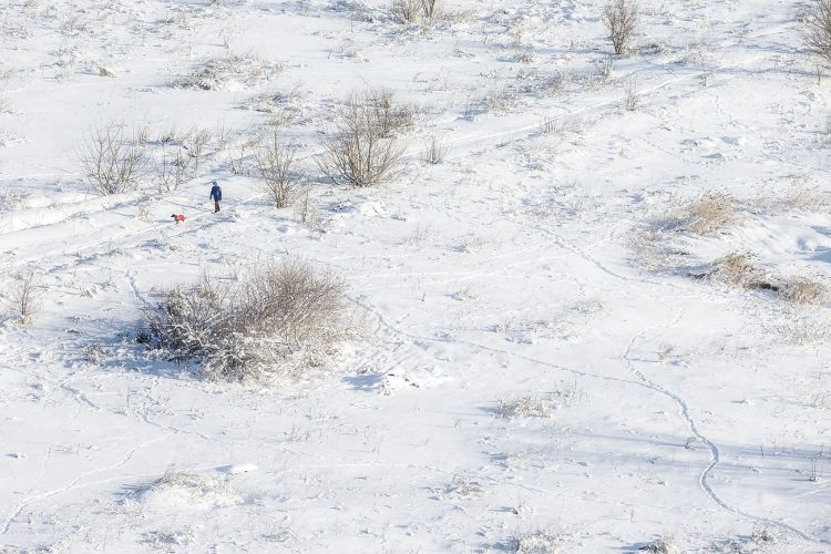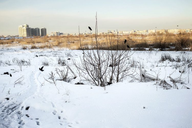 Man walking his dog in Vacaresti pit as seen in Bucharest on December 31, 2014. During Ceausescu regime the Vacaresti area, which was accommodating a 17th century monastery and a district of houses with big gardens, was demolished in order to build a lake. Since the works were abandoned in Õ88 nothing has been done here. In the presence of surfaced underground springs and plenty of time, mother nature has shape shifted the pit into a green oasis with delta like particularities where a variety of flora and fauna have blossomed. Starting 15 years ago many poor families, mainly Roma, have found shelter in the pit since the land property is still in dispute between the state and the former owners of the demolished houses. They all live in improvised shacks made from scraps they gather in the neighborhood. Those people are most resourceful when it comes to improvisation of what actually constitutes their life.
