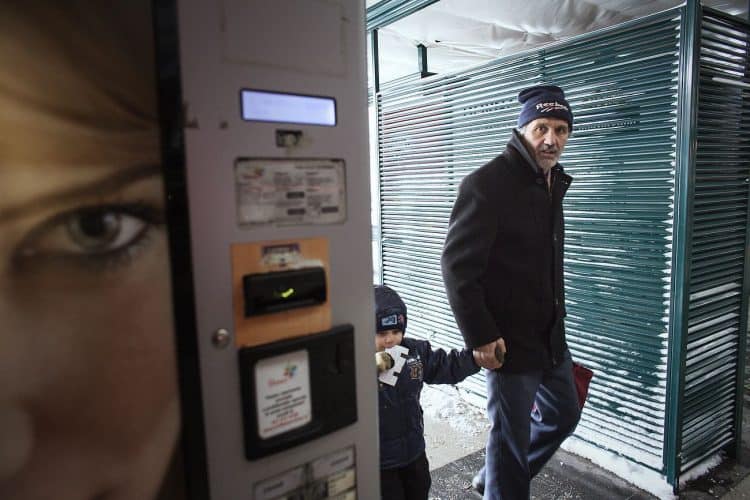 Man holding a a child walks by, as seen in Bucharest, in Gara de Nord on January 30, 2014. Weather forecasters issued a code red severe weather warning as a second wave of blizzards affects the southeastern regions of Romania disrupting road and rail traffic.