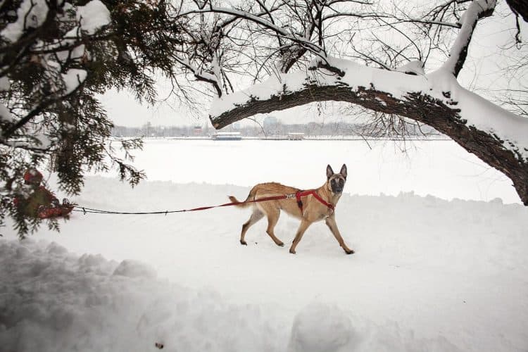 Dog pulling a sledge, as seen in Bucharest near Herastrau Lake on January 27, 2014. Weather forecasters issued a code red severe weather warning as a second wave of blizzards affects the southeastern regions of Romania disrupting road and rail traffic.