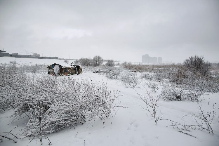 People as seen inside Vacaresti pit in Bucharest on December 29, 2014. During Ceausescu regime the Vacaresti area, which was accommodating a 17th century monastery and a district of houses with big gardens, was demolished in order to build a lake. Since the works were abandoned in Õ88 nothing has been done here. In the presence of surfaced underground springs and plenty of time, mother nature has shape shifted the pit into a green oasis with delta like particularities where a variety of flora and fauna have blossomed. Starting 15 years ago many poor families, mainly Roma, have found shelter in the pit since the land property is still in dispute between the state and the former owners of the demolished houses. They all live in improvised shacks made from scraps they gather in the neighborhood. Those people are most resourceful when it comes to improvisation of what actually constitutes their life.