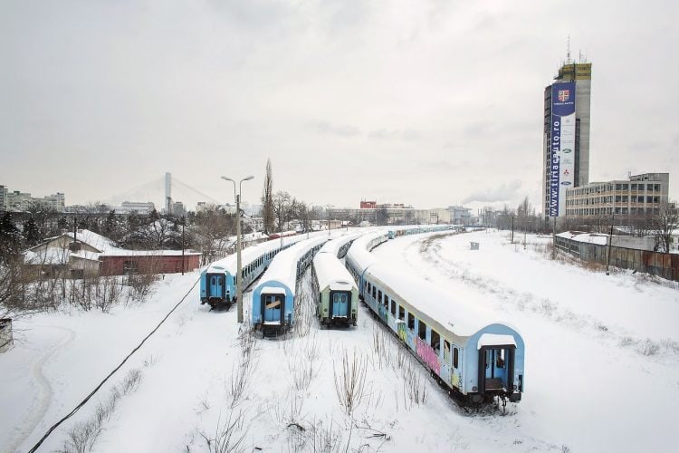 Abandoned train carts as seen in Bucharest near Gara de Nord on January 30, 2014. Weather forecasters issued a code red severe weather warning as a second wave of blizzards affects the southeastern regions of Romania disrupting road and rail traffic.